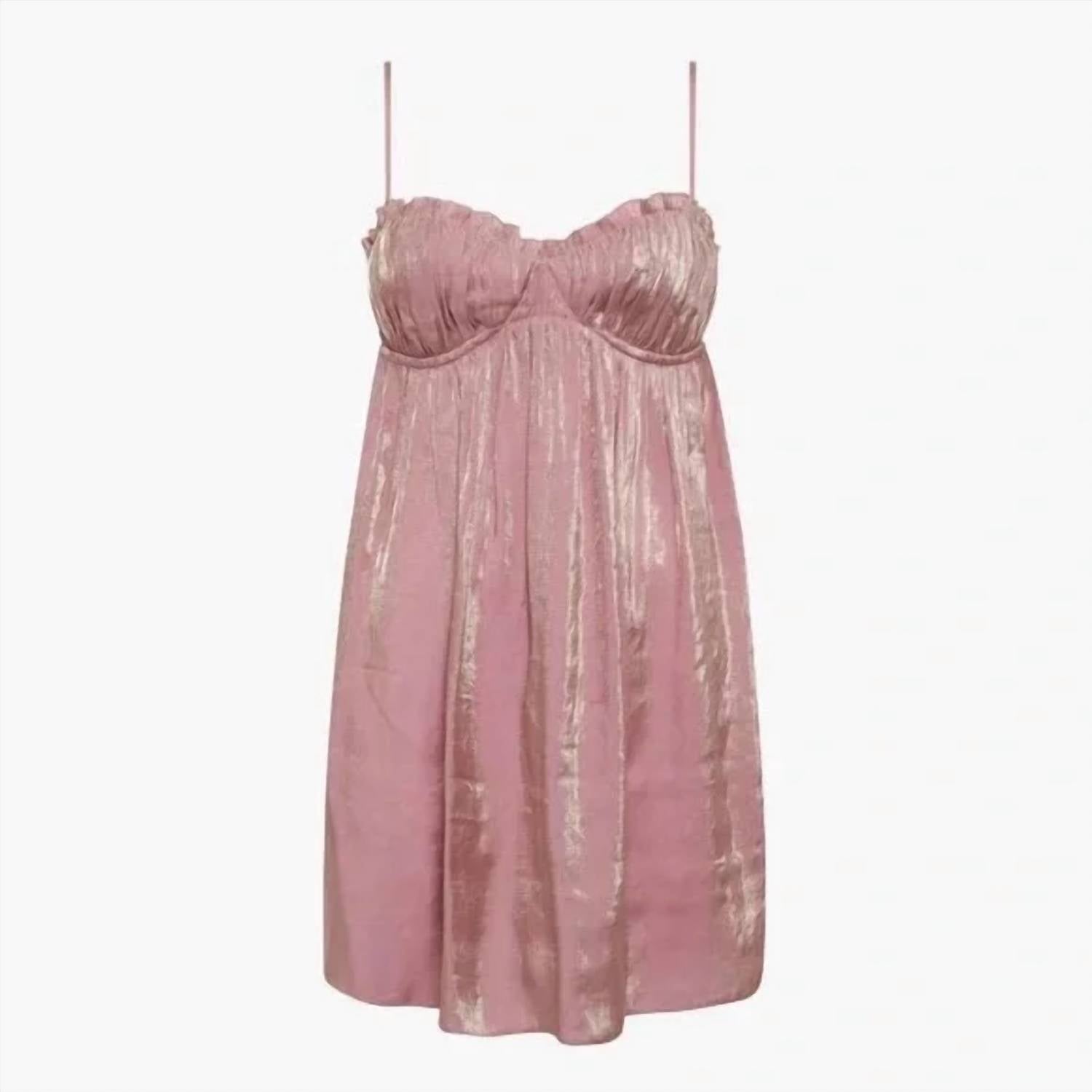 A short and breezy dress for those warmer days. Step into elegance with the Dollhouse Mini Dress by Rumored, a stunning piece in a vibrant Sunrise hue. This minimalist and solid-colored dress features delicate spaghetti straps, providing a chic and feminine touch. Crafted from a blend of 78% Rayon and 22% Polyester, it offers a babydoll fit with an empire waist silhouette, enhanced by a ruched bust detail and ruffled sweetheart neckline. This fully lined dress ensures comfort with its elastic back panel for stretch and underwire support, making it a perfect choice for a spring evening event. Care: Dry clean only.