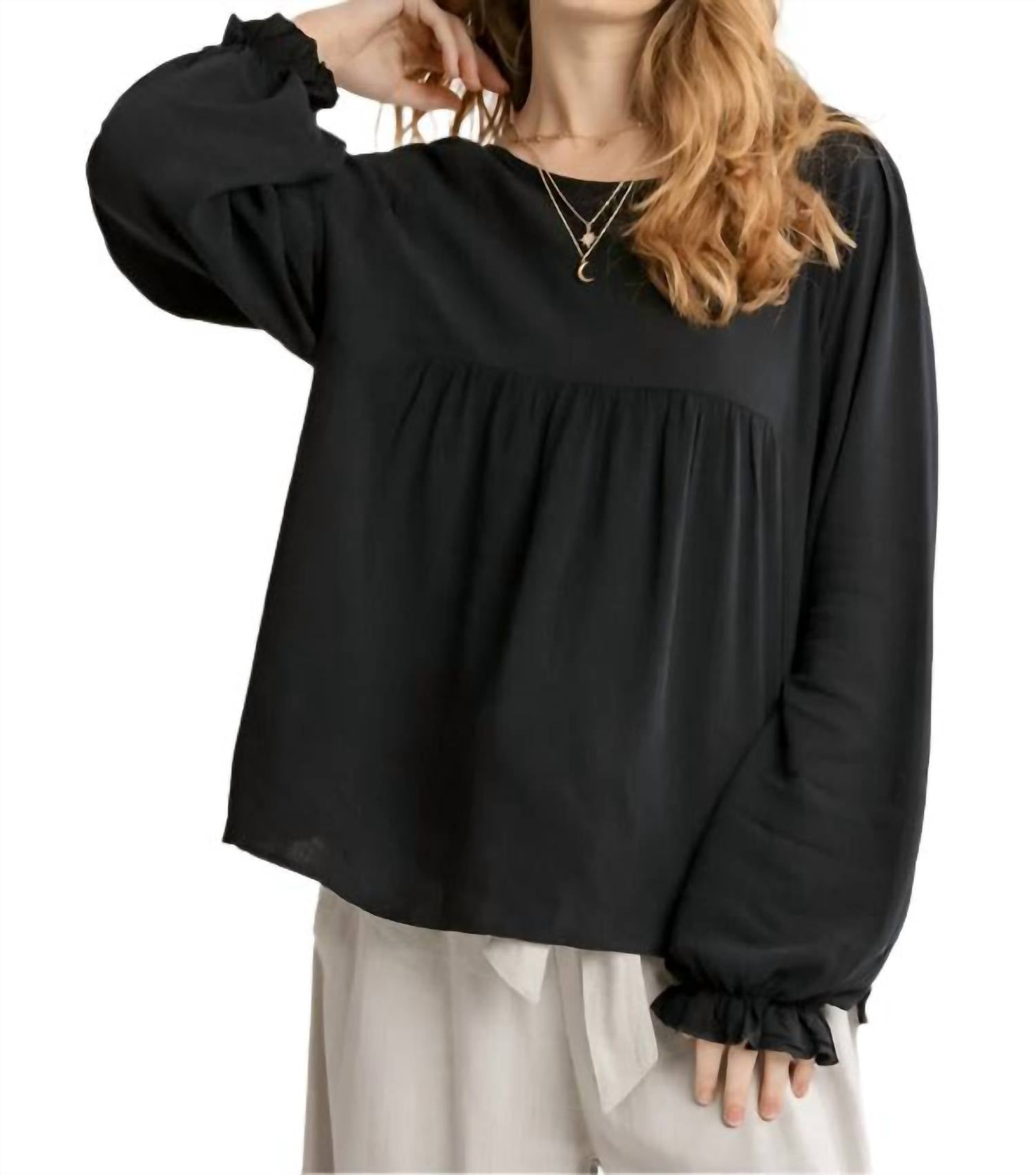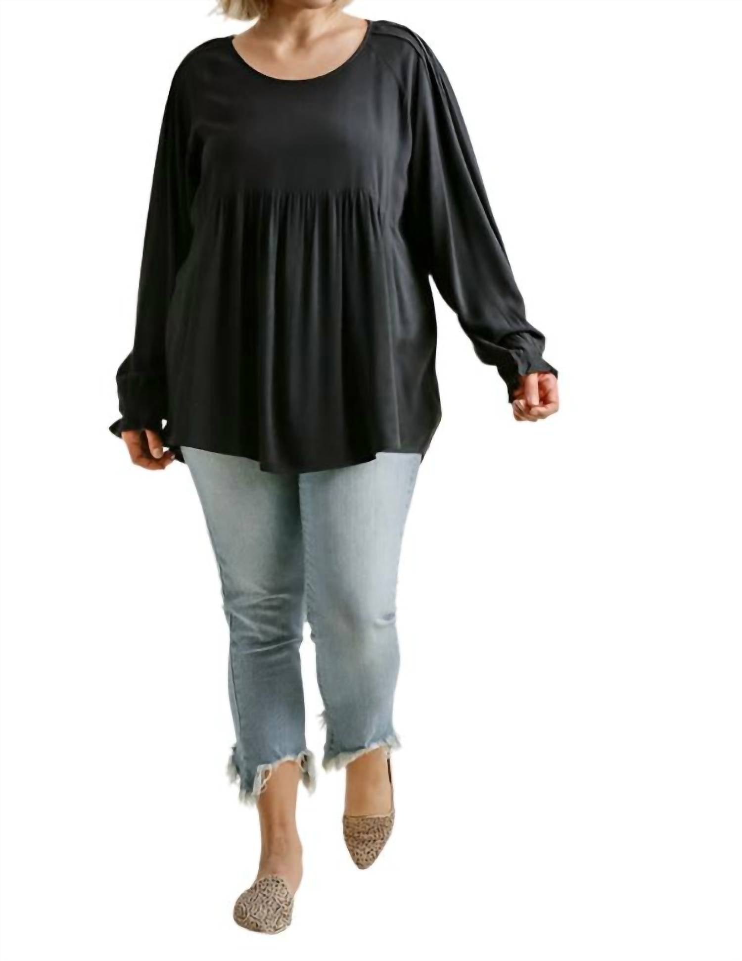 A versatile blouse that works from desk to dinner! Elevate your style with the Pleated Detail Babydoll Top by Umgee, a charming addition to any wardrobe in classic black. This long sleeve top boasts a trendy bohemian-inspired design with a round neckline, pleated shoulder details, and an oversized A-line silhouette. Made from a linen blend of 55% Linen and 45% Rayon, it features a pull-on closure and is imported. Care: Hand wash recommended. Available in varied bust sizes: Small 40", Medium 42", Large 44", XL 48", 1X 50", and 2X 52", all with a length of 27" for regular sizes and 31" for plus sizes.