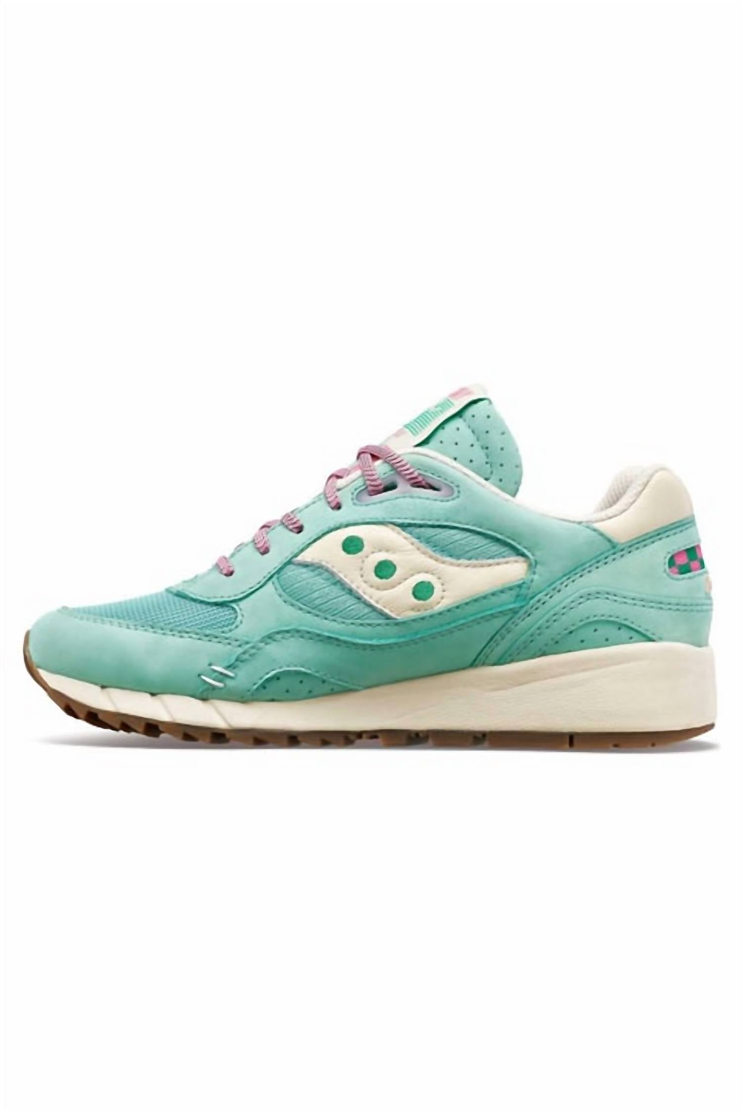 Introducing the Men's Shadow 6000 Earth Citizen Low Top Sneakers by SAUCONY, a stylish choice in refreshing Aqua/White. These sneakers feature a panelled design with perforated nubuck and soft suede materials, complete with a round toe and front lace-up fastening. Each pair boasts a logo patch at the tongue, along with a branded leather insole and durable rubber sole, while recycled cork lines the footbeds for added comfort. Experience the blend of sky-like hues and warm tones, ideal for those looking to reflect a defined landscape.