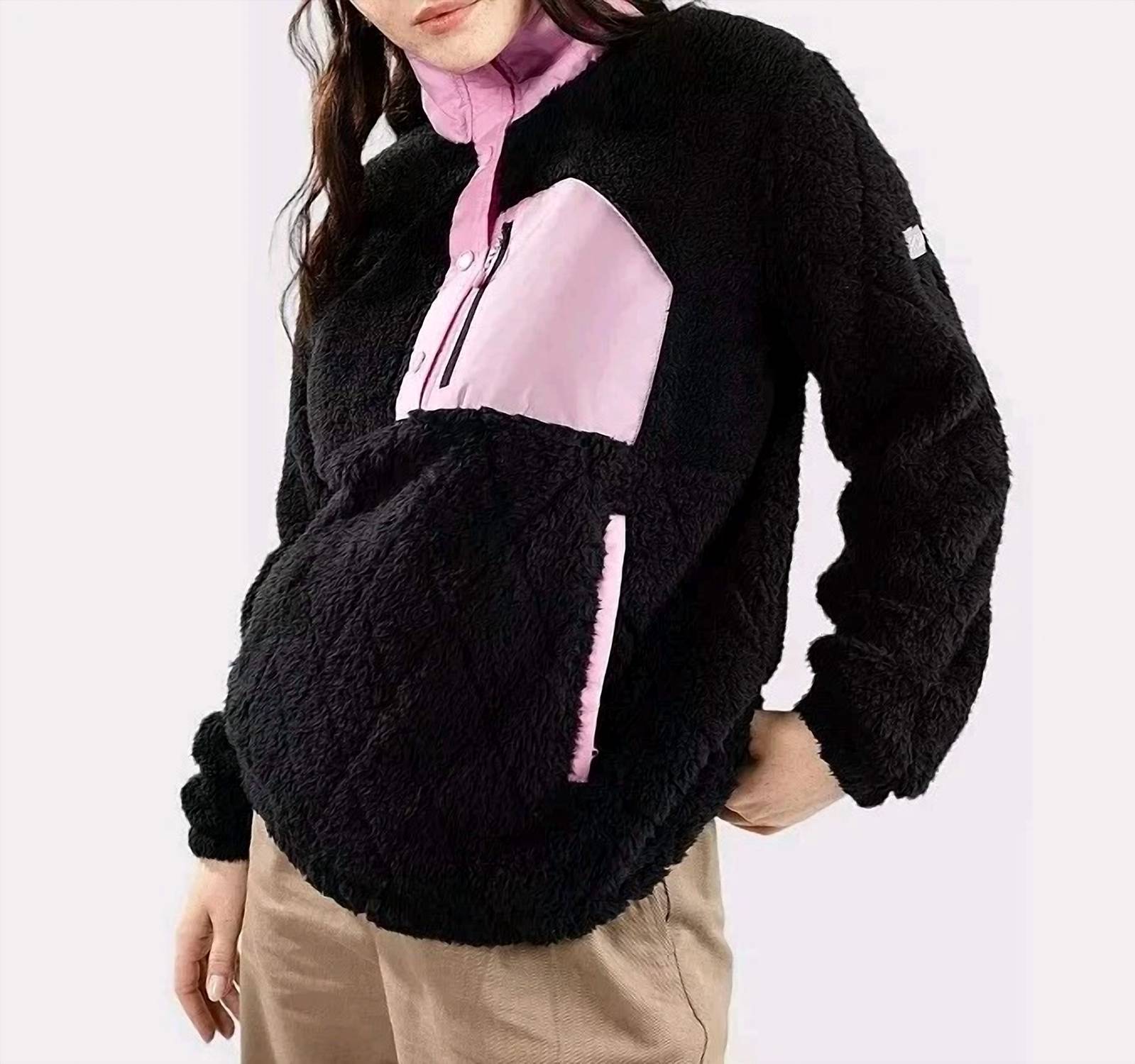 Cute, casual, and comfortable. This jacket is a must have. Made from recycled polyester sherpa taffeta, this eco-conscious layer features a mock neck, long sleeves, and a snap-front placket. Zippered hand and chest pockets offer secure storage, while an adjustable hem with a toggle drawcord provides a customizable fit.
