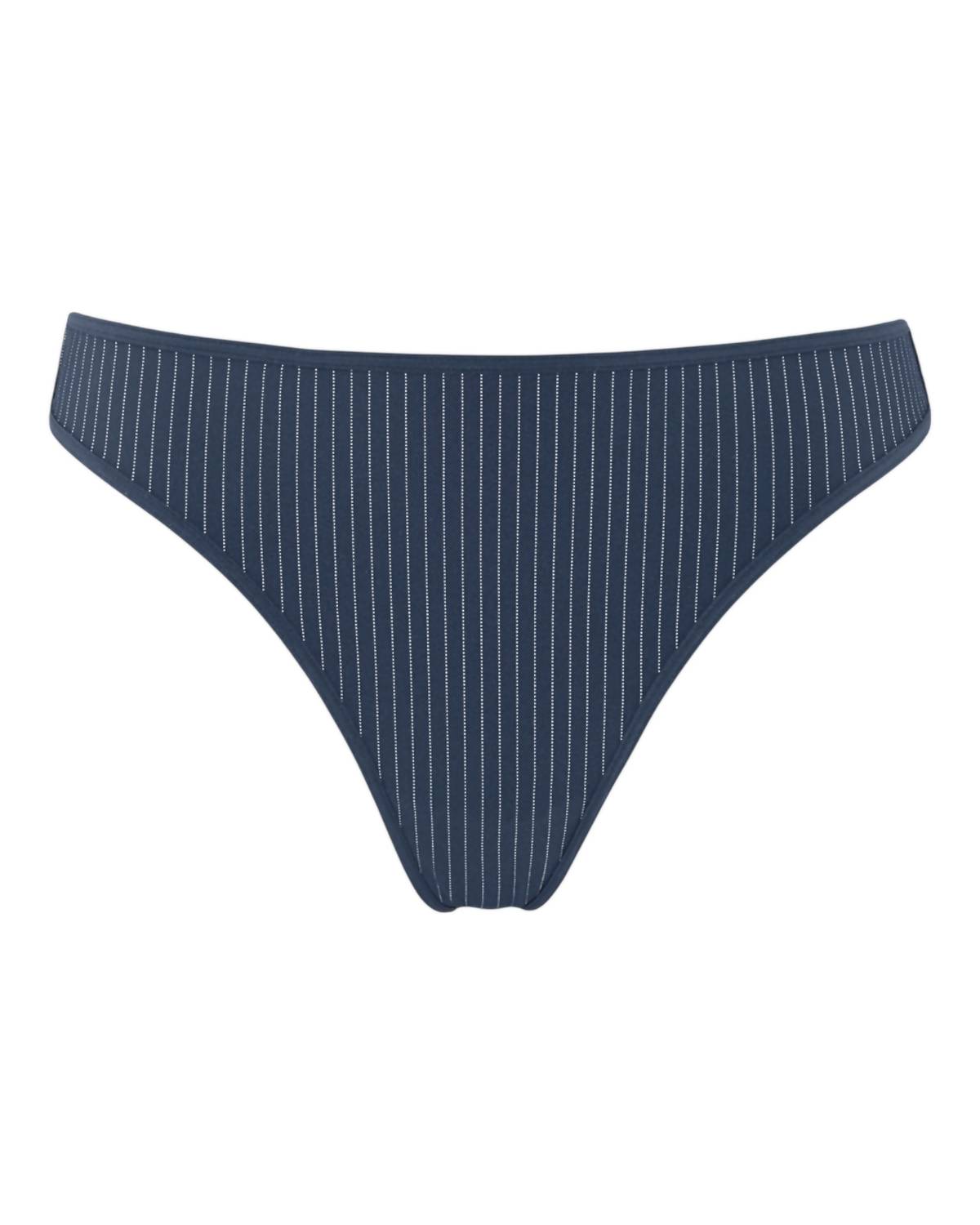 Feeling good starts with your first layer. This women's thong features a bold blue stripe pattern and is made from 83% nylon and 17% elastane for a comfortable, stretchy fit. With a high-rise waist and extra cheeky coverage, it’s a stylish addition to your lingerie collection. For best care, hand wash in cold water and lay flat to dry.