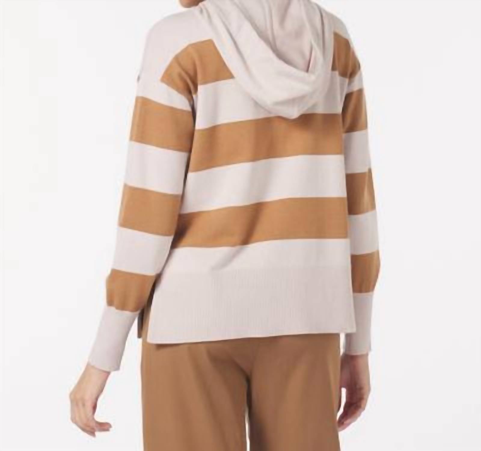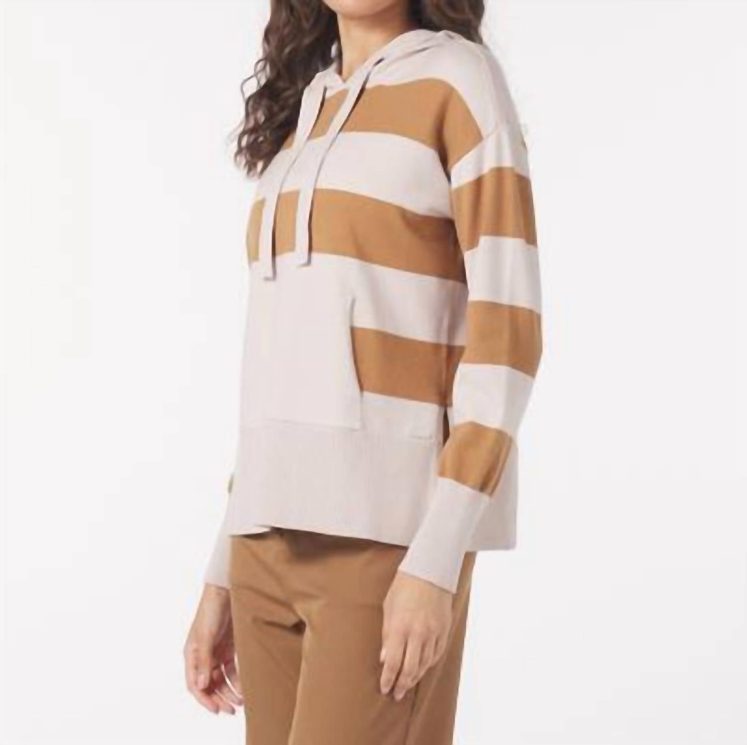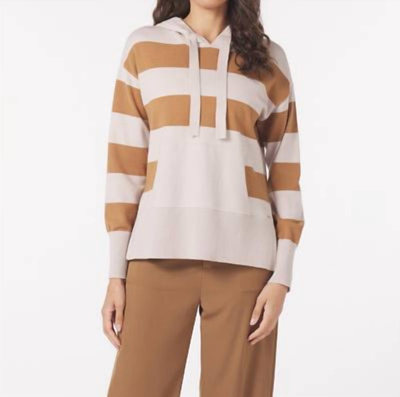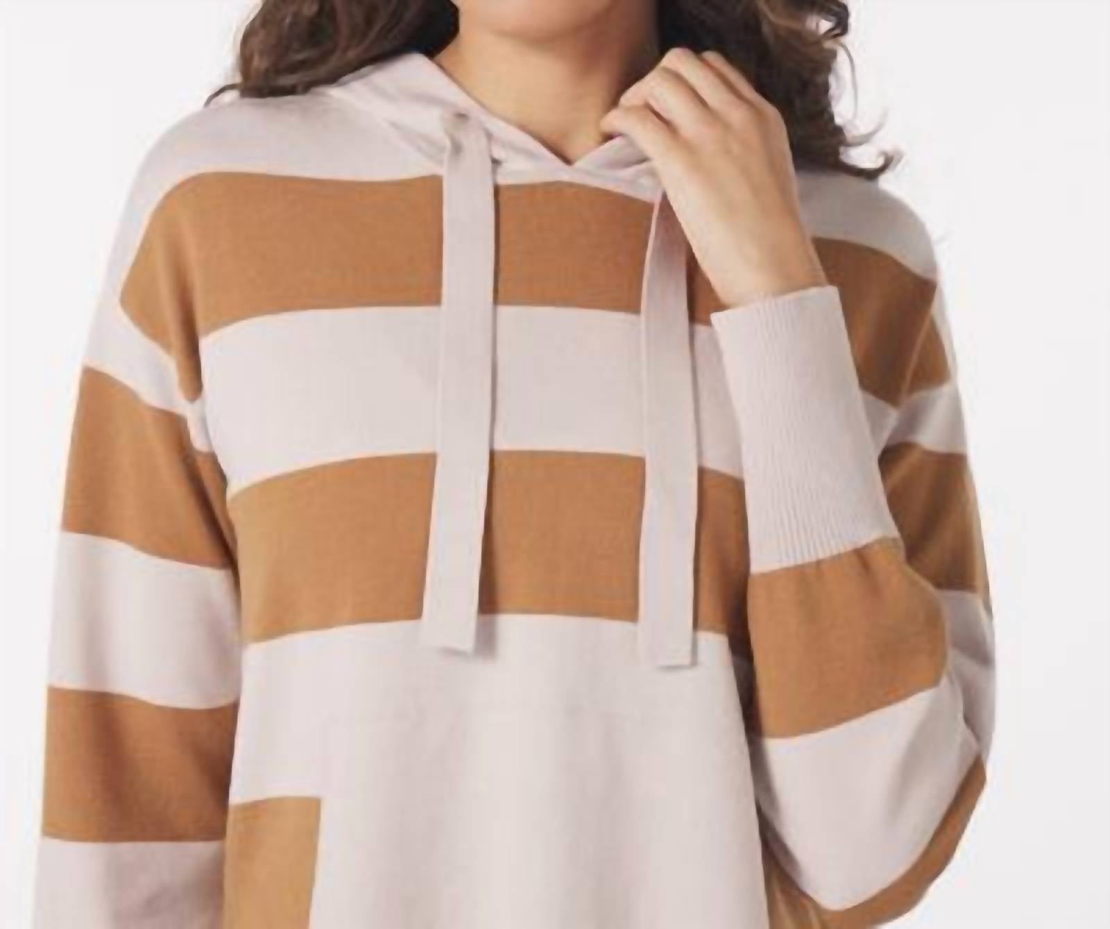 Cooler temps call for layering and we love this adorable sweatshirt for all the obvious reasons. Elevate your loungewear with the Glyder Elite Hoodie, an epitome of comfort and style in an Oatmilk/Almond stripe. This long sleeve sweatshirt is crafted with Elite Knit fabric, providing a soft and chic finish, while the oversized fit and hooded neckline offer a cozy appeal ideal for winter travel. Featuring a convenient front pocket and seamless pull-on closure, it's designed for effortless streetwear vibes. Model's measurements: Height 5'10", Chest 32", Waist 26", Hips 37".