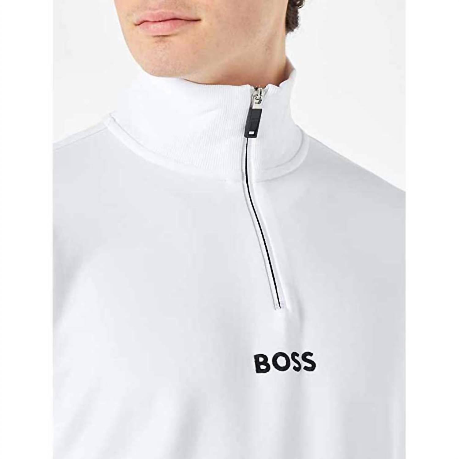 Quarter zip sweat with rib collar. Zip with special layout. Branding logo in tatami embroidery. 83% cotton 14% polyester 3% elastane. Machine wash.