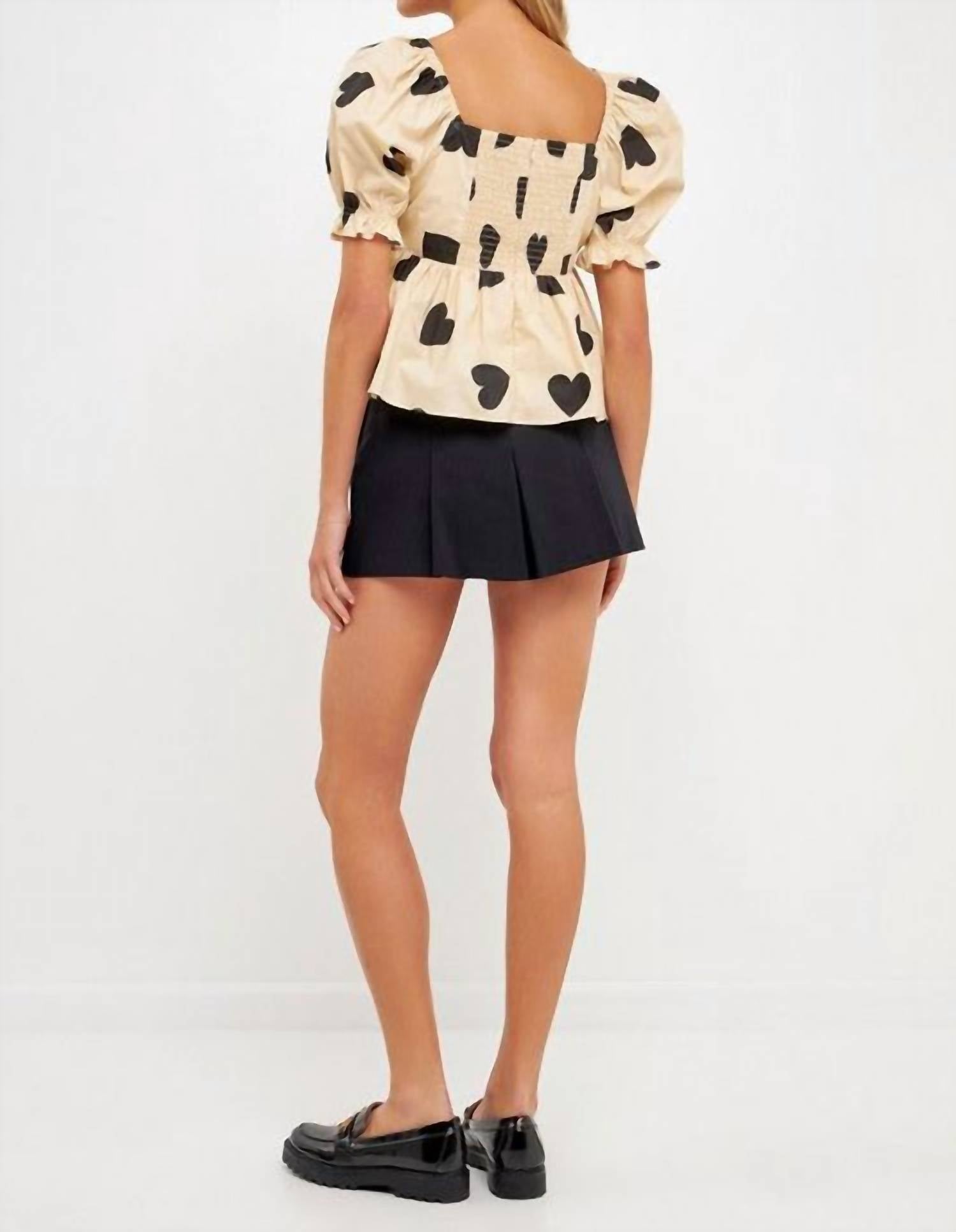 Pair this crop top with your favorite high-waisted jeans or maxi skirt. Heart print with twisted detail on the front, sweetheart neckline, puff sleeves, lined, smocked on the back. True to size. Hand wash cold. 100% Cotton.