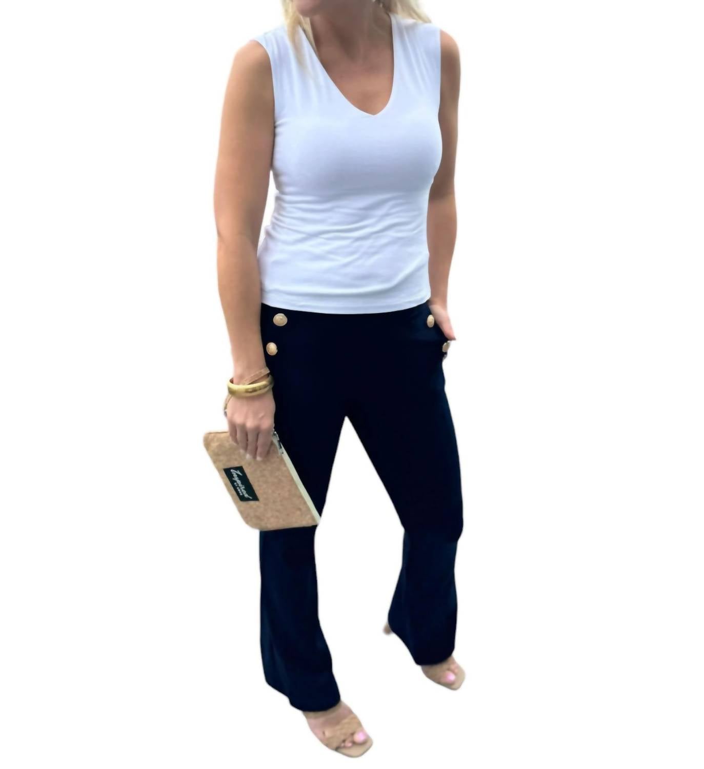 This Ponte pant featuring a pull on waist, pockets, gold button detail, and a full length flare hem. Style them with our Mom Tank. and gold hoops for a polished business look. 68% Viscose 27% Nylon 5% Spandex.