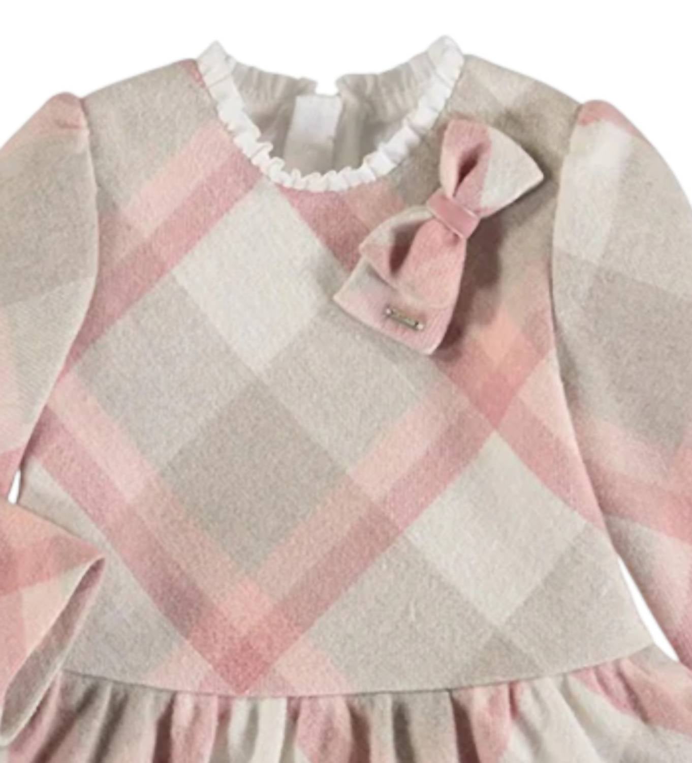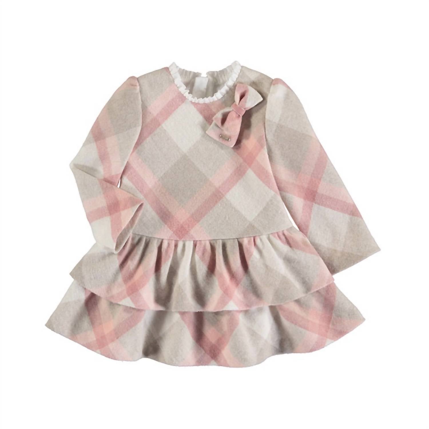 Dress your little one in charm and style with the Kid's Tiered Ruffle Neck Plaid Dress by Mayoral. This dress boasts soft long sleeves and is composed of 35% Polyester, 33% Acrylic, 16% Wool, 11% Cotton, and 5% Other Fibers, ensuring comfort and durability. It features a fitted body with a double-tiered ruffle skirt and a soft-lined interior for a snug fit. Designed for easy wear, it has an invisible zip closure at the back and should be machine washed cold, laid flat to dry, and ironed cool for care. Ideal for a spring holiday party or Easter occasion, this oversized brushed plaid dress in blush hits above the knee for an adorable look.