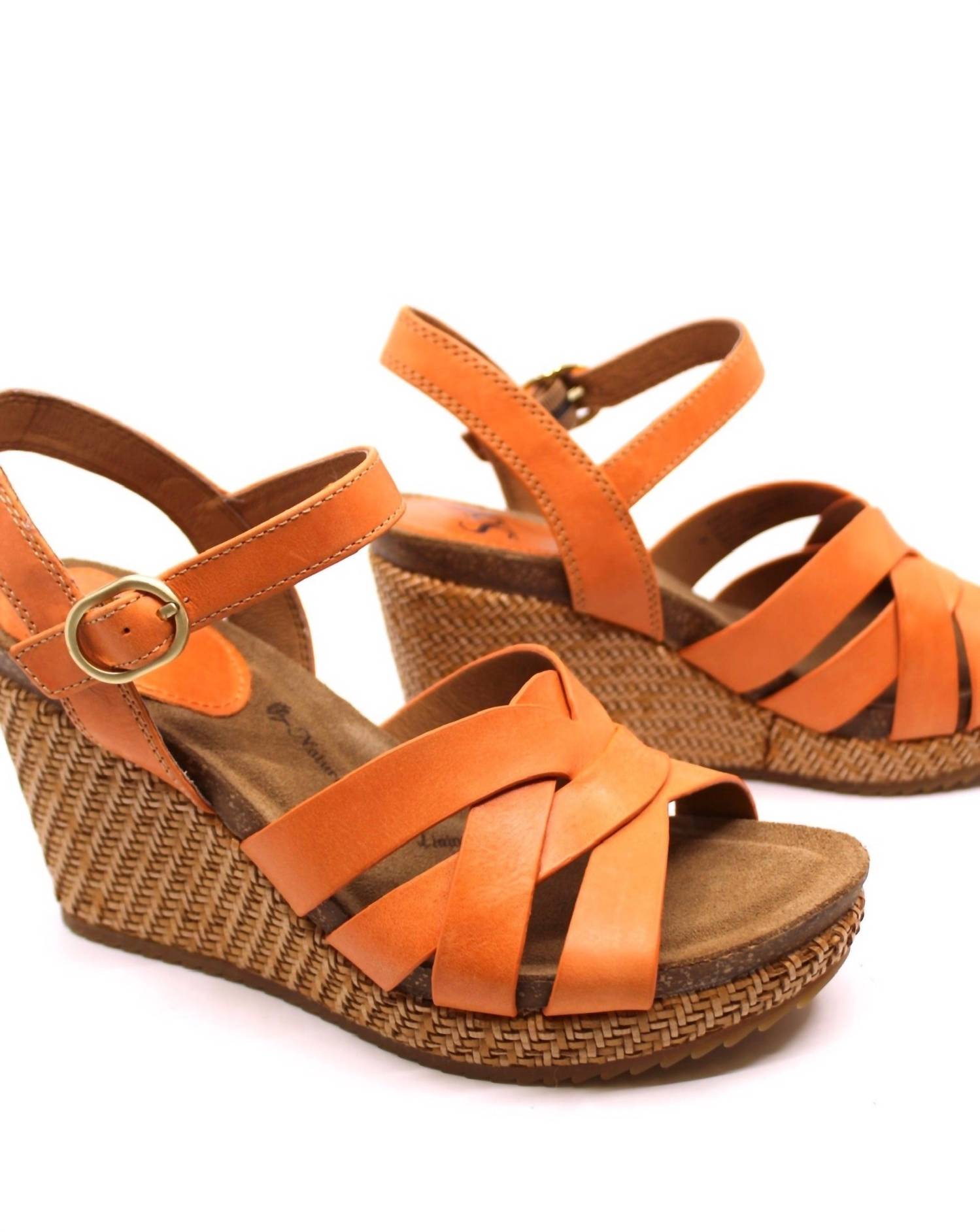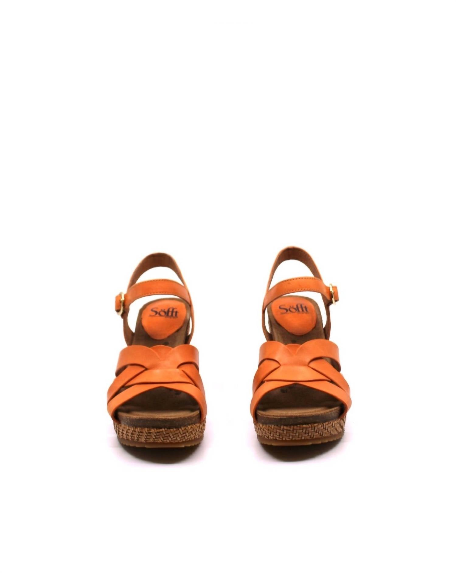 Adjustable buckle. Leather lining. Suede-lined cork-EVA footbed with raised foam. Wrapped basketweave PU wedge with TPR outsole. Heel height: 3 1/2 inches.