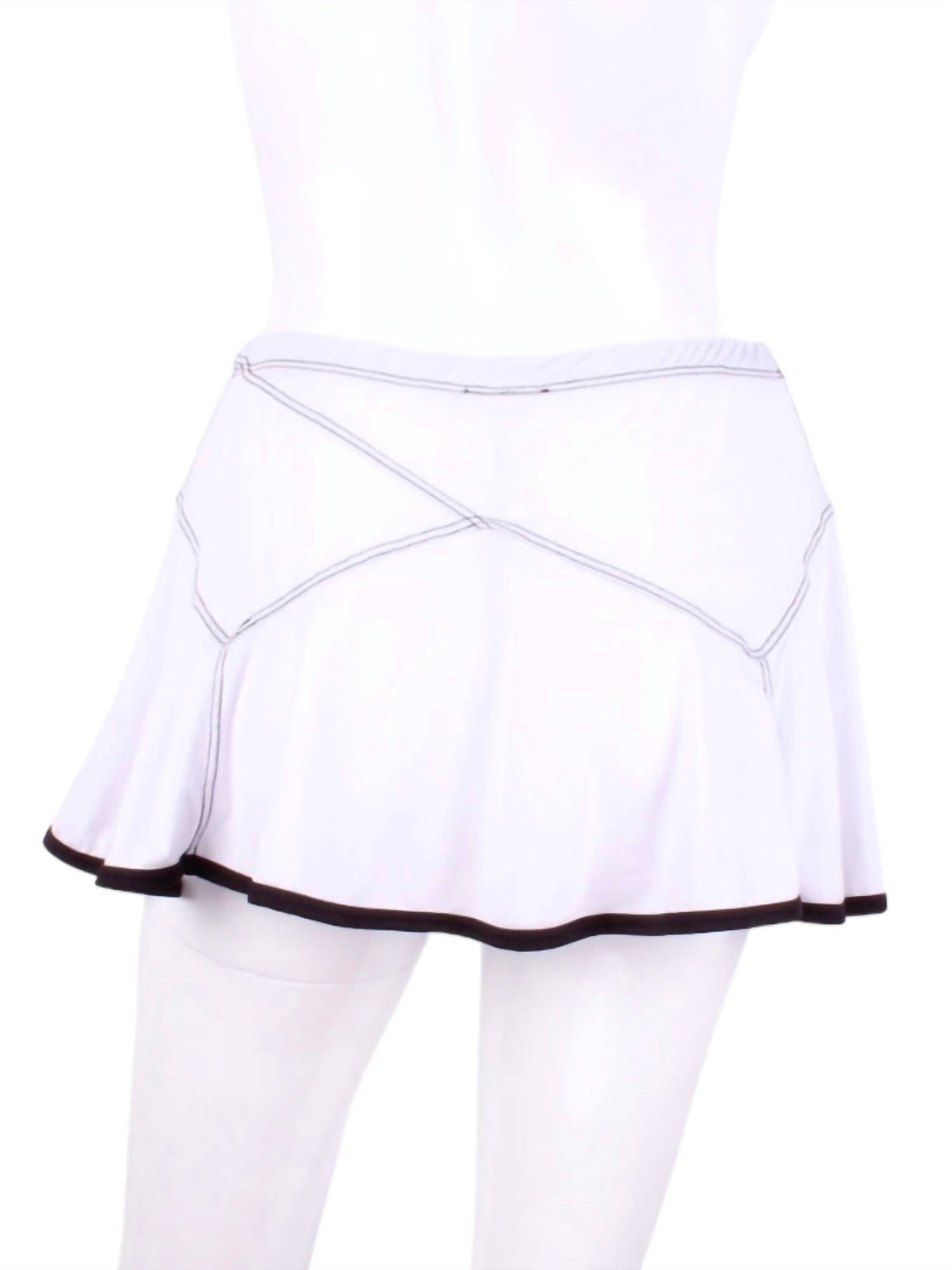 The perfect mini skirt does exist. Introducing the Love Love Tennis Triangle Trim Skirt, a stylish mini skirt in white with black trim perfect for game day. Designed for women, this patterned piece is part of the athleisure trend, ideal for summer. It features a convenient pull-on closure, ensuring comfort and ease of wear. Created in small quantities, this skirt offers a unique blend of luxury and comfort. Suitable for activewear, please refer to sizing instructions for a perfect fit.