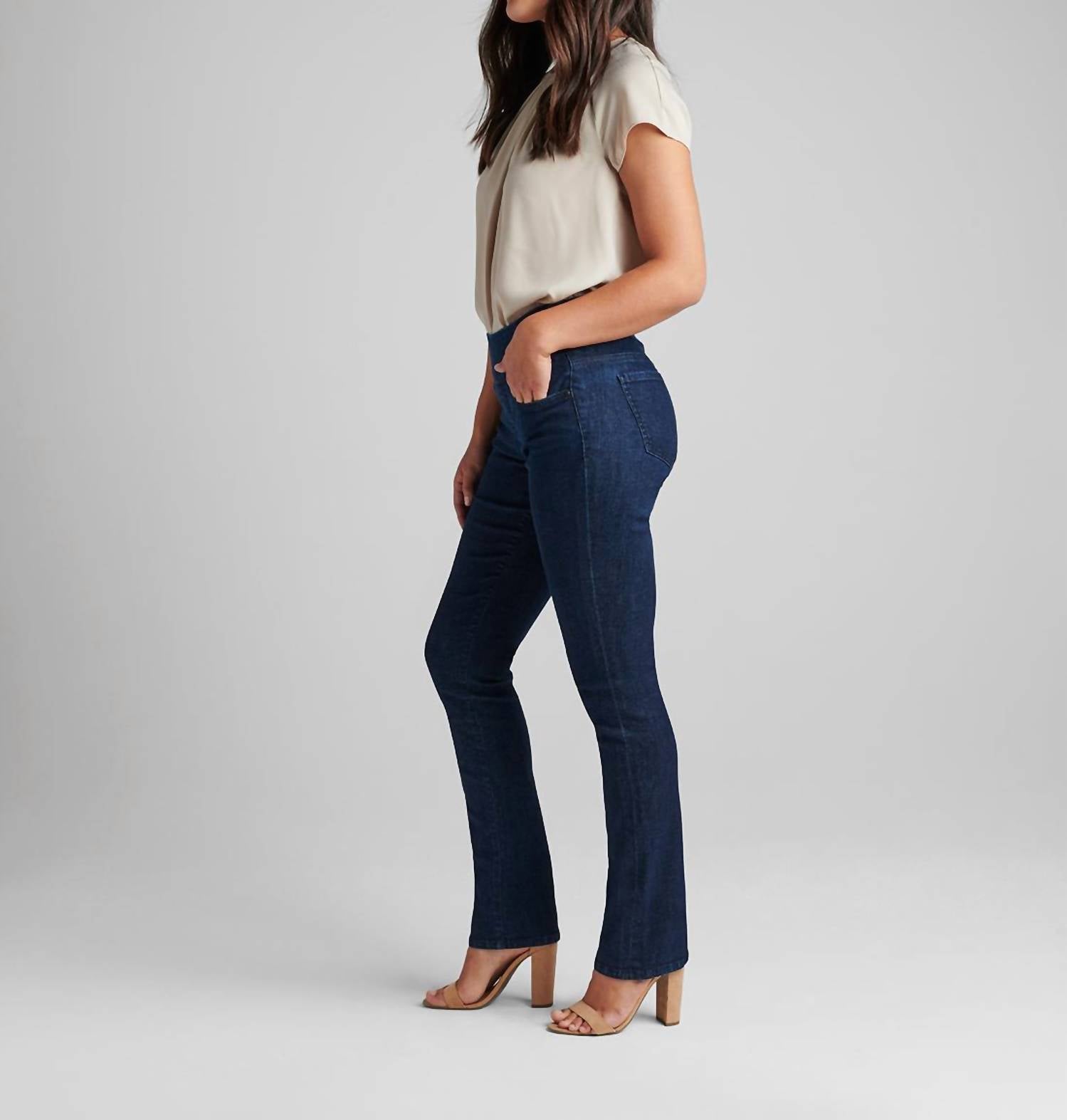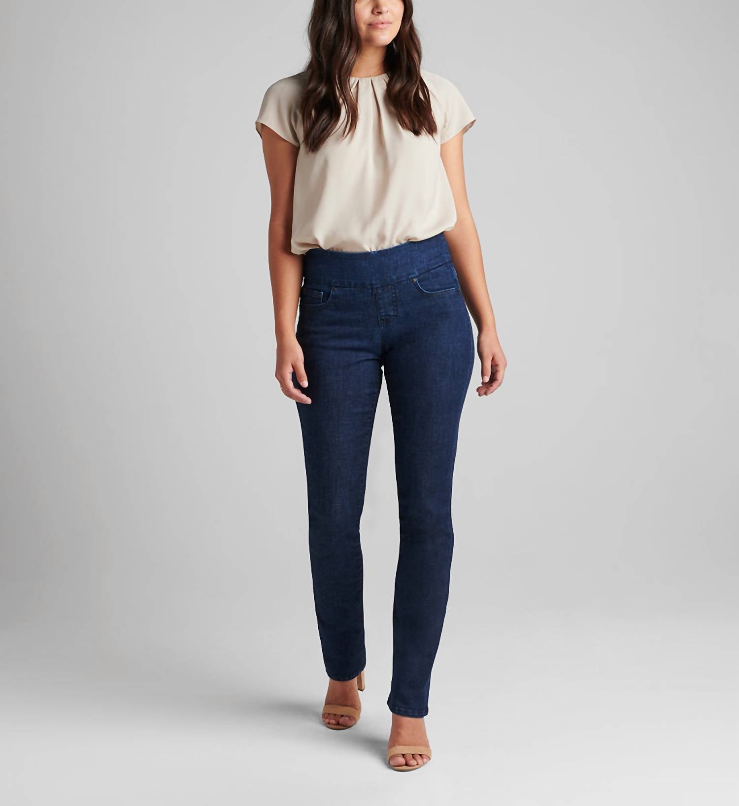 Designed for a comfortable and flattering fit. Feature a mid-rise waist with a 9.75" rise, offering a smooth, pull-on waistband without zippers or buttons for a polished look. Crafted from Power Stretch Sustainable Denim. Incorporate Repreve recycled polyester, providing flexibility and softness with an environmentally conscious touch. Slim straight-leg silhouette boasts a 14.75" leg opening, 33" inseam, and functional 5-pocket styling. Pull-on. Machine wash, tumble dry.
