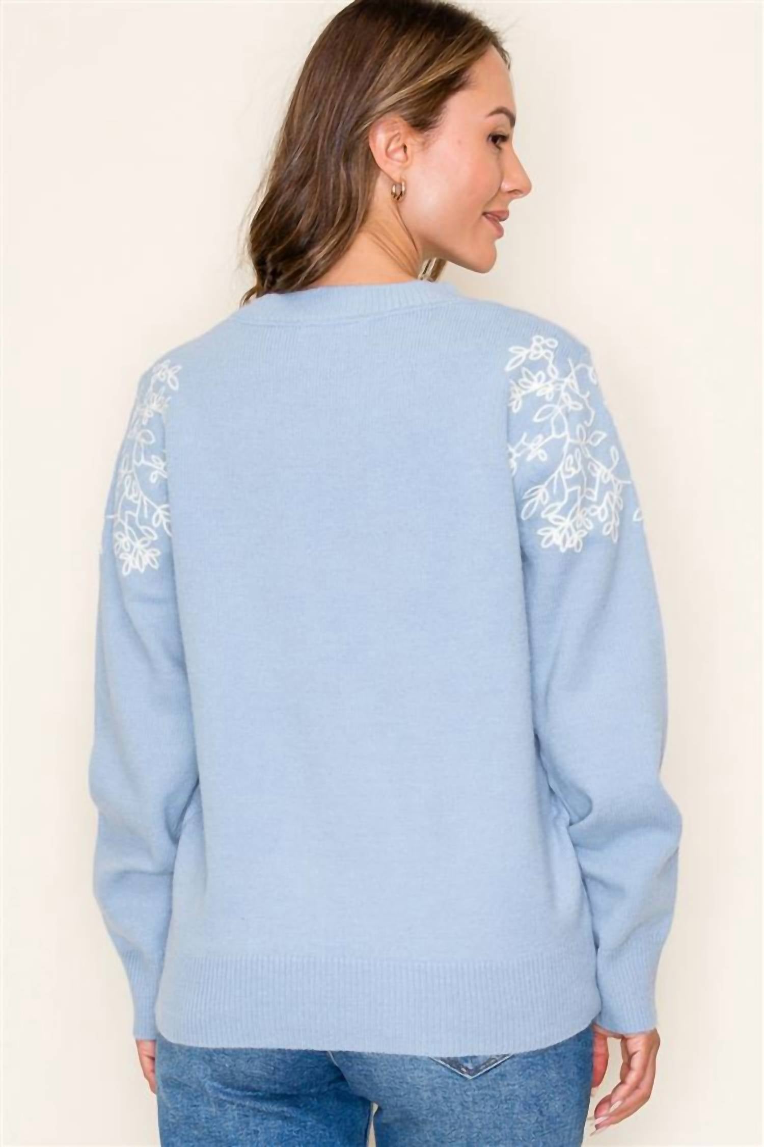 Experience the perfect blend of comfort and style with this trendy crew neck sweater, designed to effortlessly elevate your wardrobe. Pair it with your favorite denim and loafers for the perfect look. The Angela Embroidered Sweater by STACCATO is the perfect addition to your Fall wardrobe. This knit sweater features long sleeves and a crewneck, offering both warmth and style with its soft white embroidery detail at the shoulders. Designed in a light blue grey shade, it's a versatile piece for various occasions like Thanksgiving or a housewarming. Closure is a convenient pull-on style, and it's easy to maintain with machine wash care instructions.