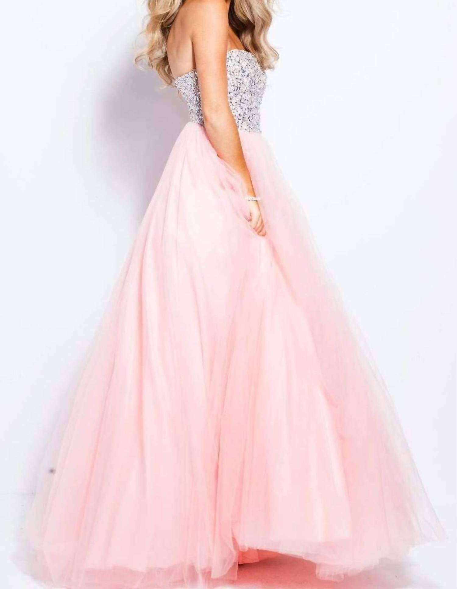 Style this maxi with your favorite statement necklace and sandals for the perfect look. Introducing the Strapless Adorned Tulle Ballgown by Jovani, an exquisite choice for any special occasion. This gown features a strapless design with a sweetheart neckline and is crafted from luxurious sequin and tulle materials, showcasing a floor-length, A-line silhouette that flares into a ballgown skirt. Detailed with sparkling embellishments, this stunning dress comes in shades of blush and aqua. It offers a zip closure at the back and must be spot dry cleaned only for care.