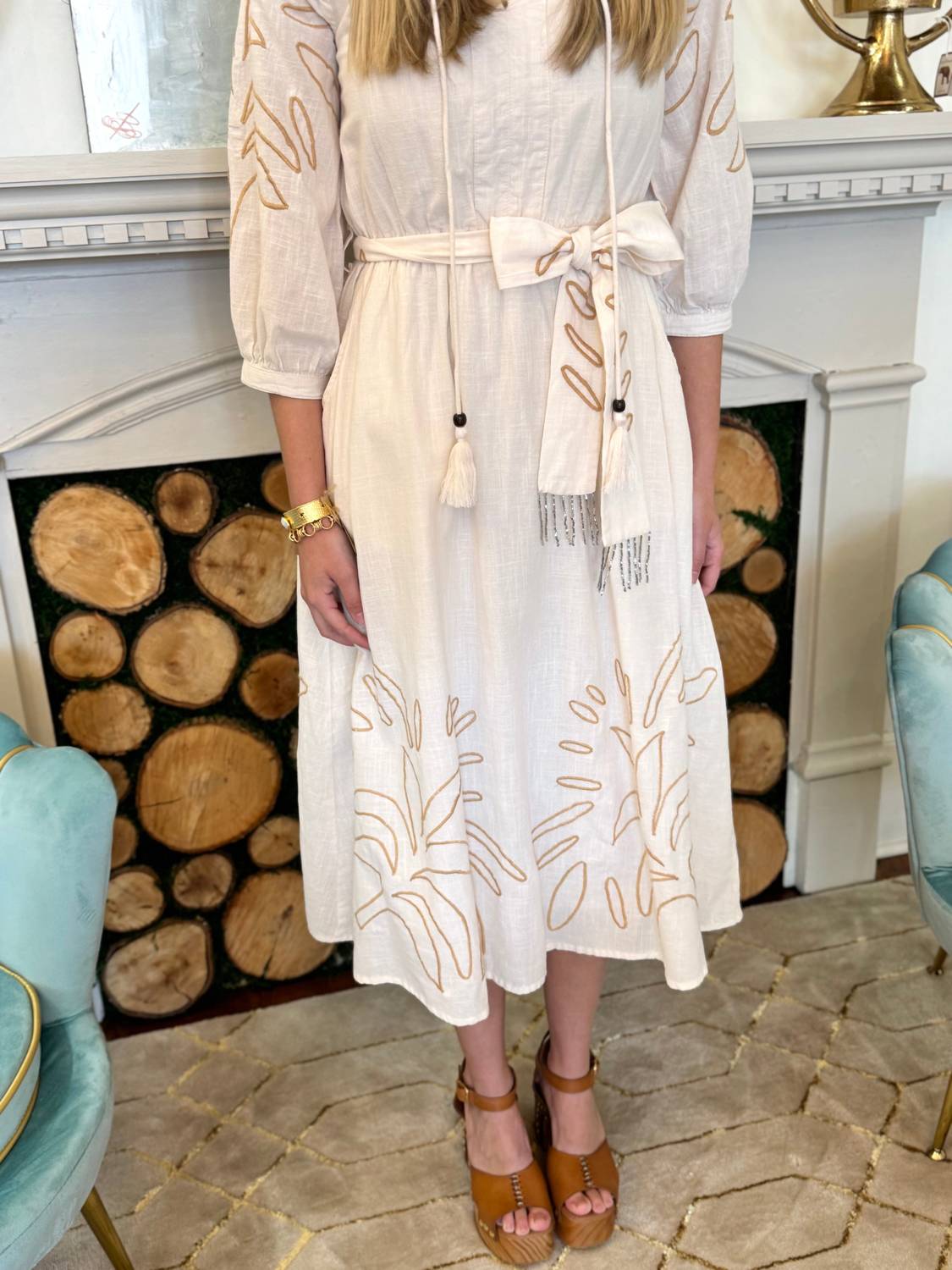 A midi dress so versatile, your options for wearing it are endless. The CIEBON Embroidered Midi Dress in Cream/Sand is a perfect blend of elegance and versatility. With its three-quarter sleeves and delicate embroidered details, this wrap silhouette dress is ideal for any Spring occasion. Designed with a V-neck and a Boho Chic pattern, it offers a feminine touch that enhances your style. Made for easy wear, it features a pull-on closure and can be machine washed and tumble dried for convenience.
