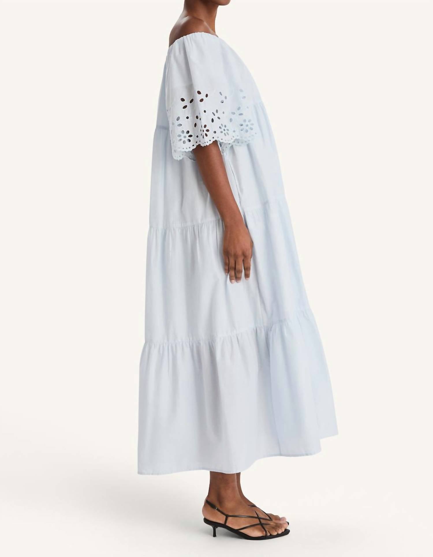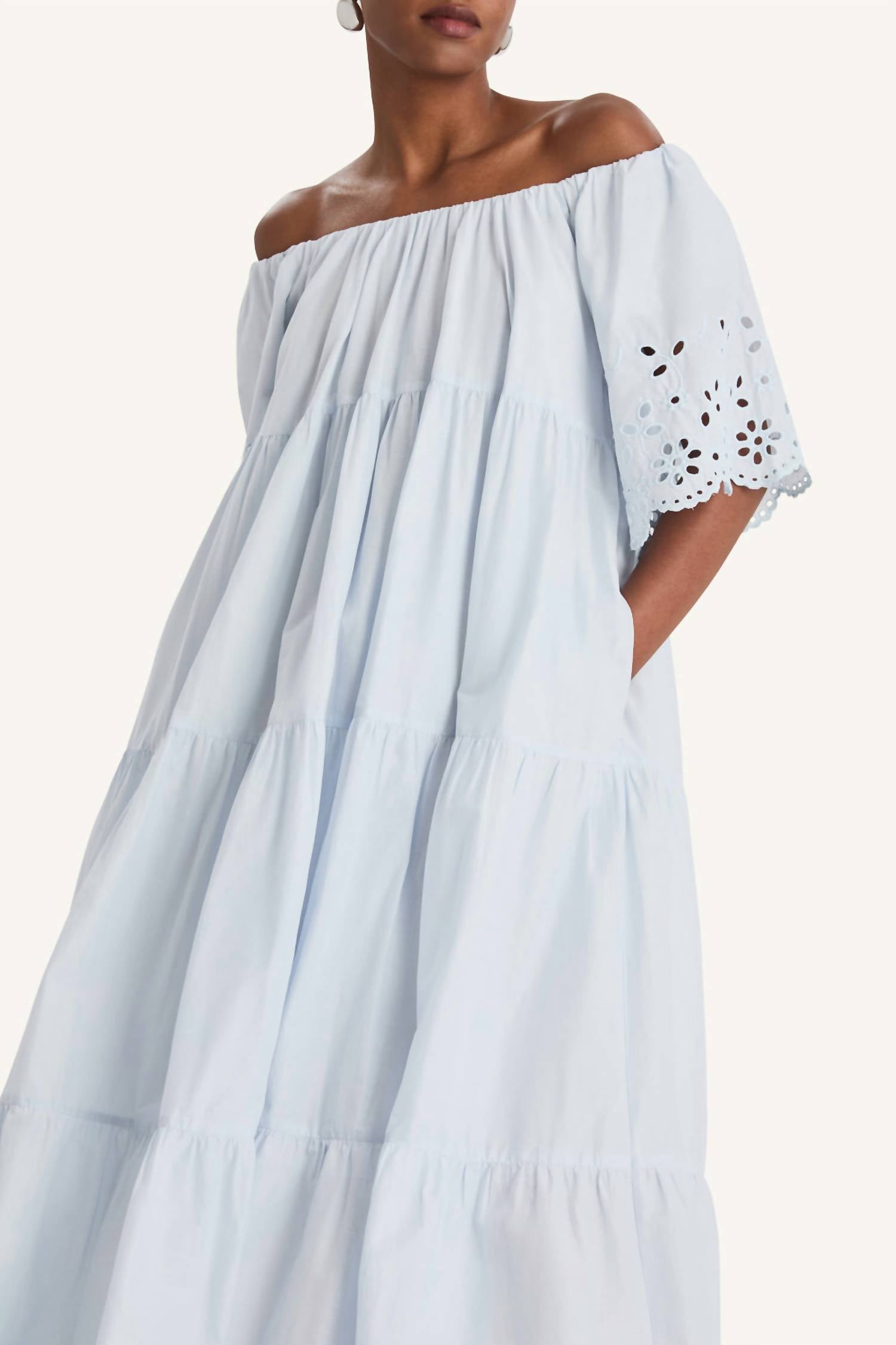 The perfect length dress does exist. The Berenson Midi Dress by Merlette exudes elegance with its short sleeves and an off-the-shoulder neckline, ideal for spring evening events. Crafted from 100% Pima Cotton Lawn, this A-line silhouette dress in a solid blue hue offers a vintage-inspired look with practical pockets. Made for effortless wear, it features a pull-on closure. Care for this piece by hand washing only.