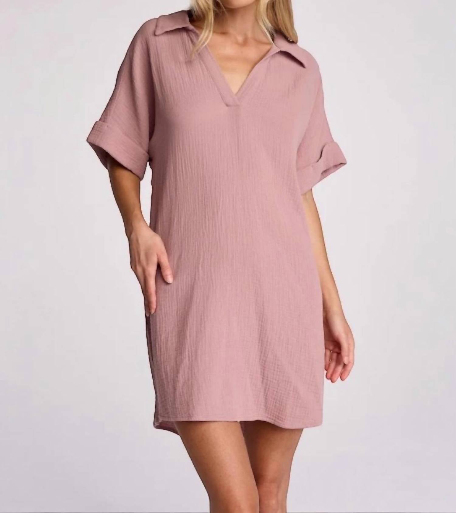 Pair with your favorite sandals for an effortlessly chic look. Meet Harper. Made from 100% cotton gauze, this dress embodies comfort and breathability. Featuring a collared neckline with a plunging split neck and a casual rolled sleeve, this is an update to the classic t-shirt dress with a slightly oversized and boxy fit. We recommend sizing down if you prefer more fitted styling. DESIGNER ID: 25-14-224 COLOR: ROSE MAUVE COMPOSITION: 100% COTTON GAUZE CARE: MACHINE WASH COLD FIT: RUNS TRUE TO SIZE The model is wearing a size XS Model measurements: 5’10”, 25” waist, 35” hips, 32” bust Imported