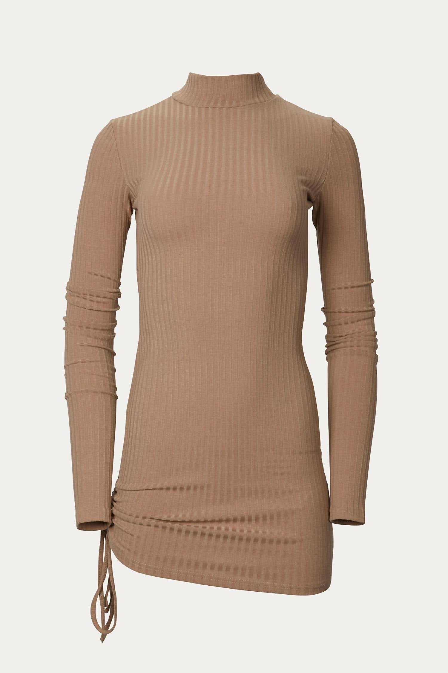 Melody's dress is made from camel ribbed-knit with extra long sleeves and a drawstring - so you can adjust the hem and create ruching throughout the skirt. Simple and flattering, it has a slim fit and cozy mock neck. Wear yours with knee boots and a clutch. Fabrication: 100% PolyesterCare: Hand wash cold, line dryStandard Clothing Sizing