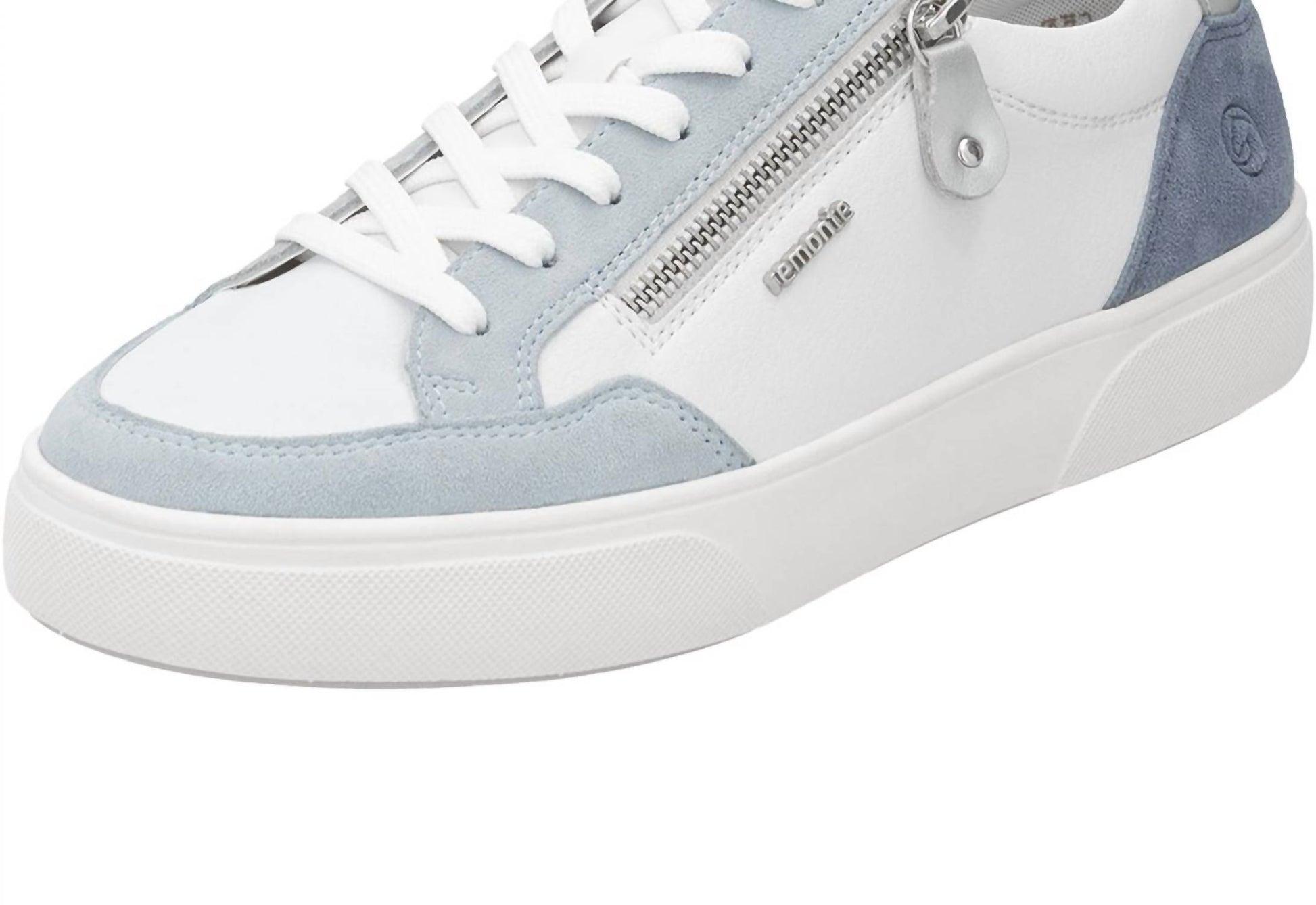 When fashion and function come together seamlessly. Step up your sneaker game with the Women's Leather Sneakers by Remonte, blending style and comfort seamlessly in Bleu/Weiss/Jeans/Silver. Crafted with a durable leather and suede upper, these sneakers feature a combined zipper and lace-front closure for easy wear. The cushioned footbed ensures all-day comfort, while the elevated rubber outsole offers a semi-platform lift for added height. Perfect for versatile styling and ideal for travel, these sneakers are a must-have this season.