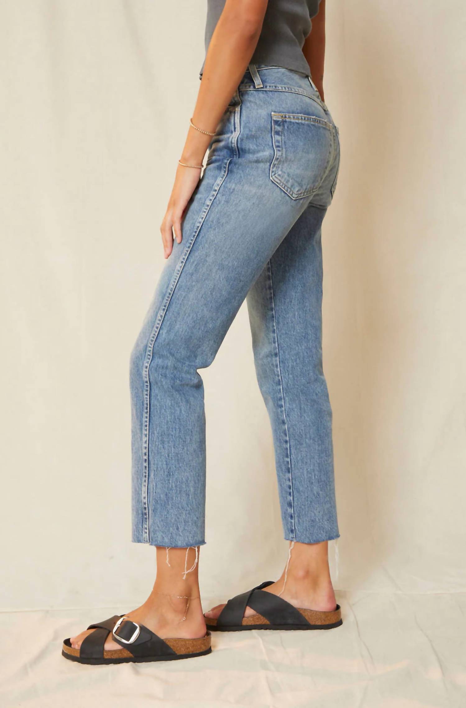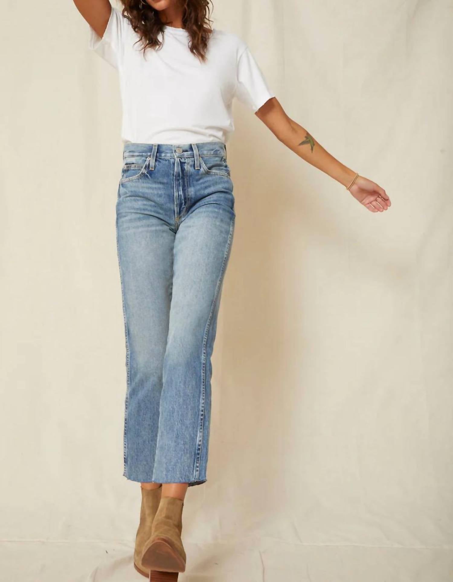This classic straight leg jean has a perfect fit and goes with just about everything. Introducing the Loverboy Denim Jean by AMO, a perfect blend of vintage charm and modern style. This women's high-rise jean features a straight leg design and frayed cropped hems, with an inseam of 26 inches. Made from 100% cotton in Los Angeles, it offers comfort and durability with a light washed finish. The button fly closure and 5-pocket styling complete this piece, ideal for those embracing 90s fashion vibes. Care: Machine wash cold and decide between hang drying or tumble drying on low heat.