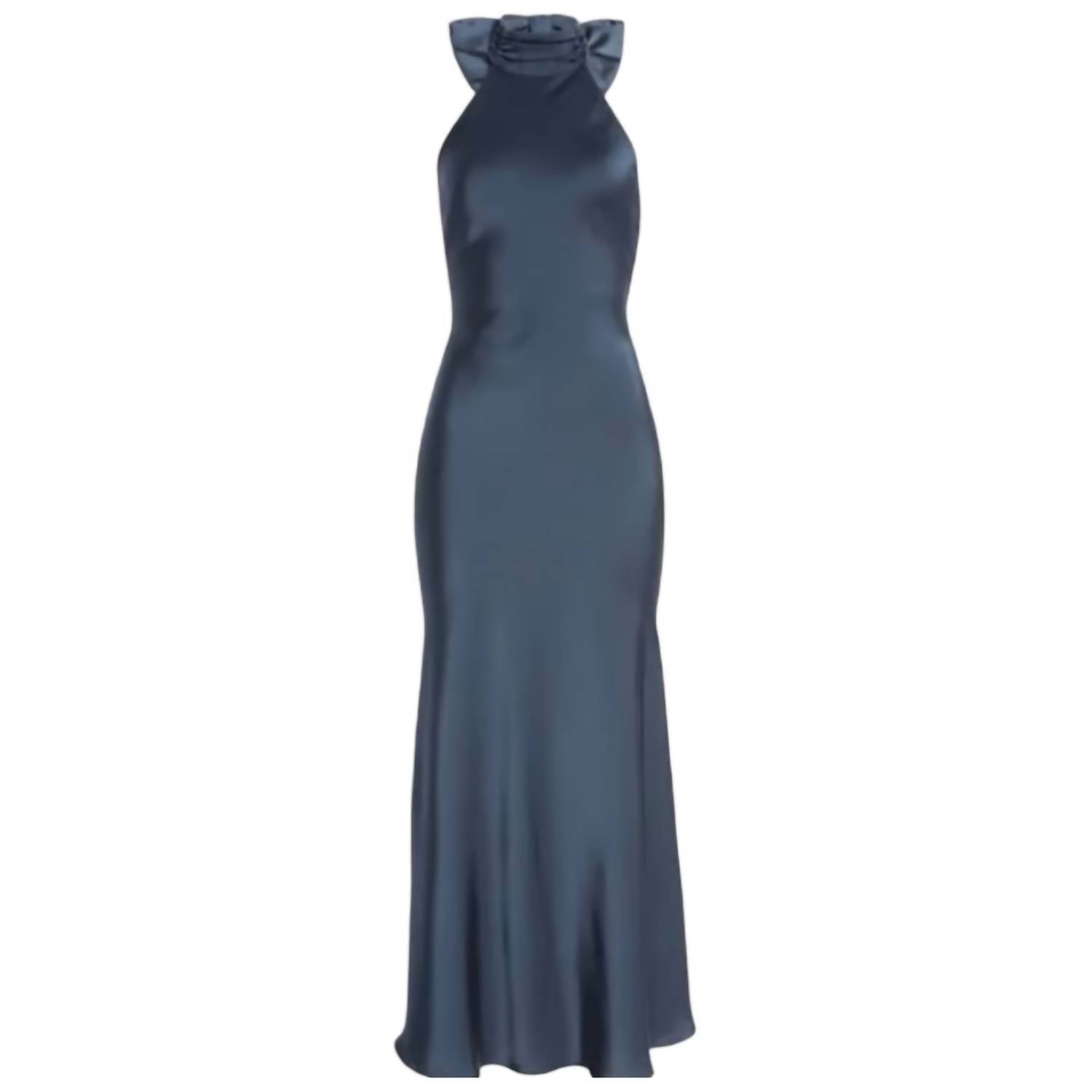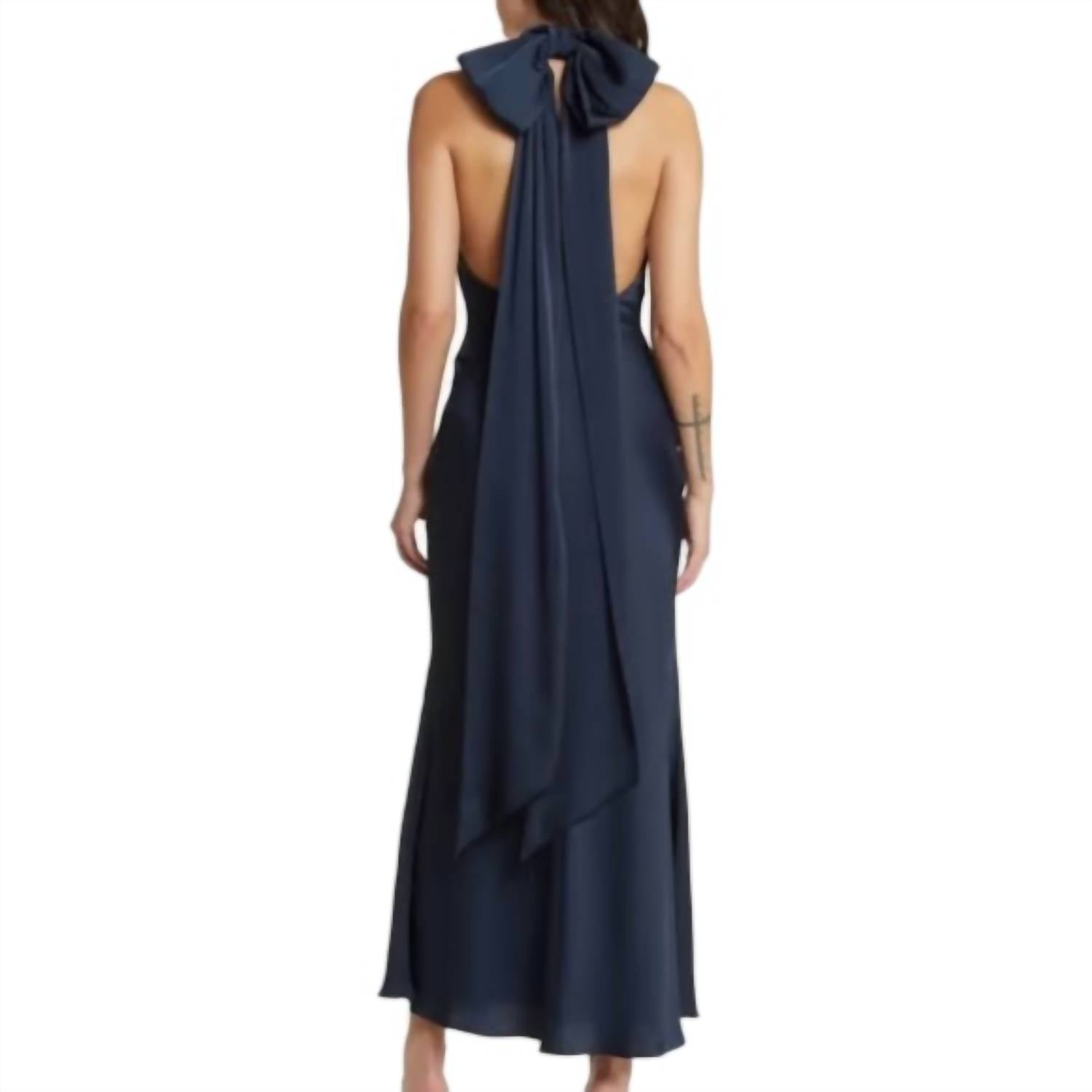 Who doesn't love a good maxi dress? This one you'll be reaching for season after season. Elevate your evening attire with the Misha Evianna Halter Neck Satin Trumpet Gown in a sophisticated navy hue. This sleeveless sheath silhouette is crafted from lush polyester satin with a dramatic open back, featuring a halterneck button loop and hidden back zipper closure for a seamless fit. Originating from China, it ensures elegance with its fully lined interior. Delicate care is advised, as the gown is dry clean only, making it a perfect choice for special occasions and 90s inspired fashion lovers.