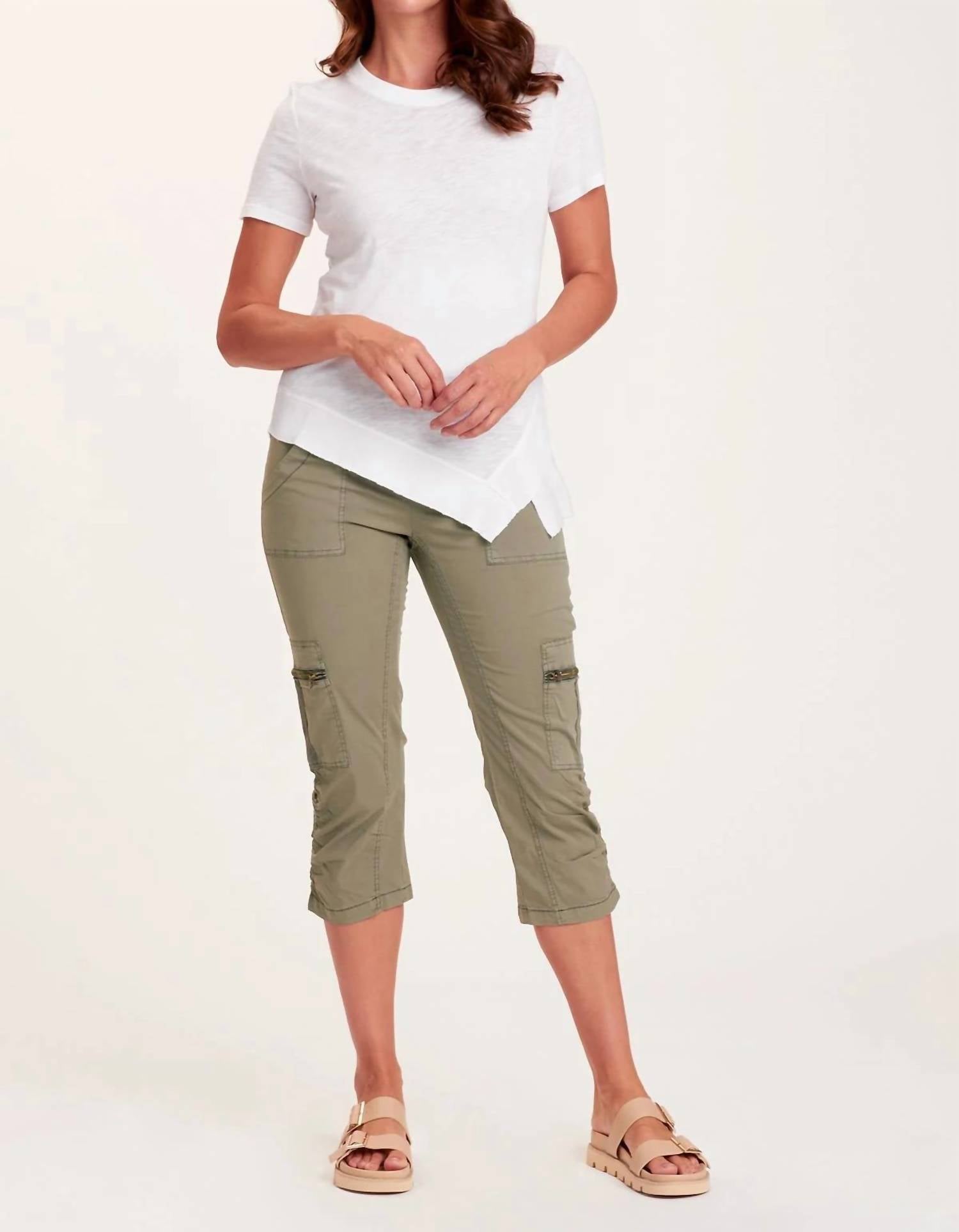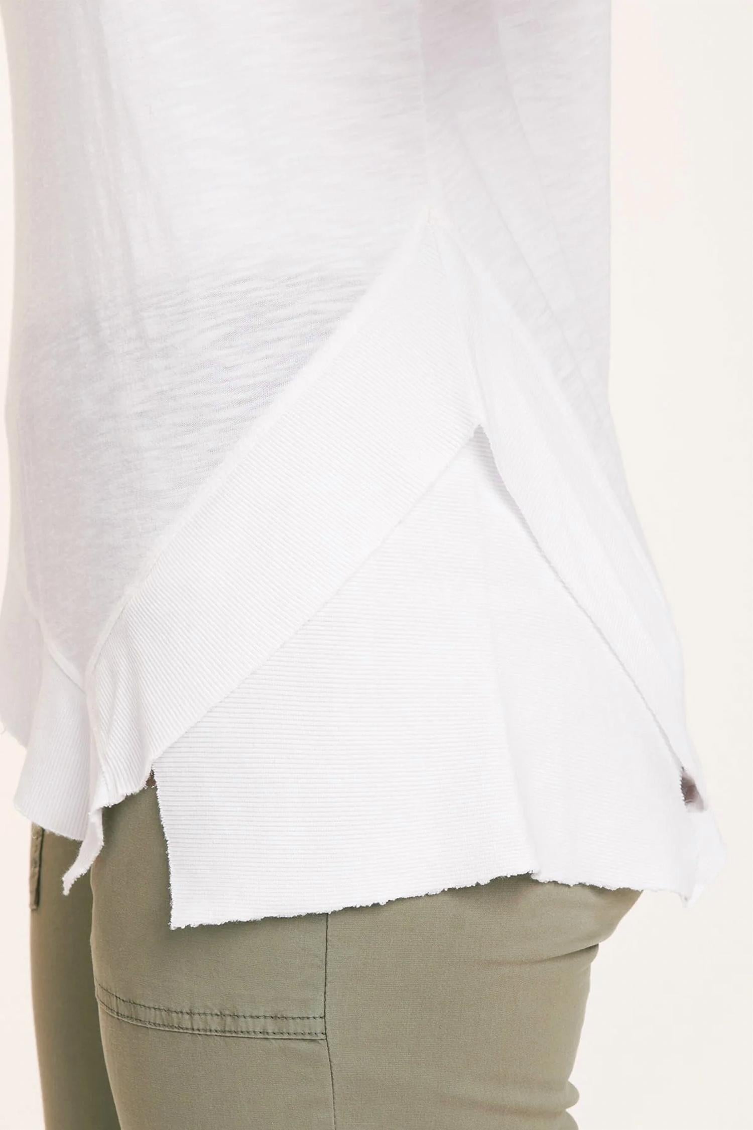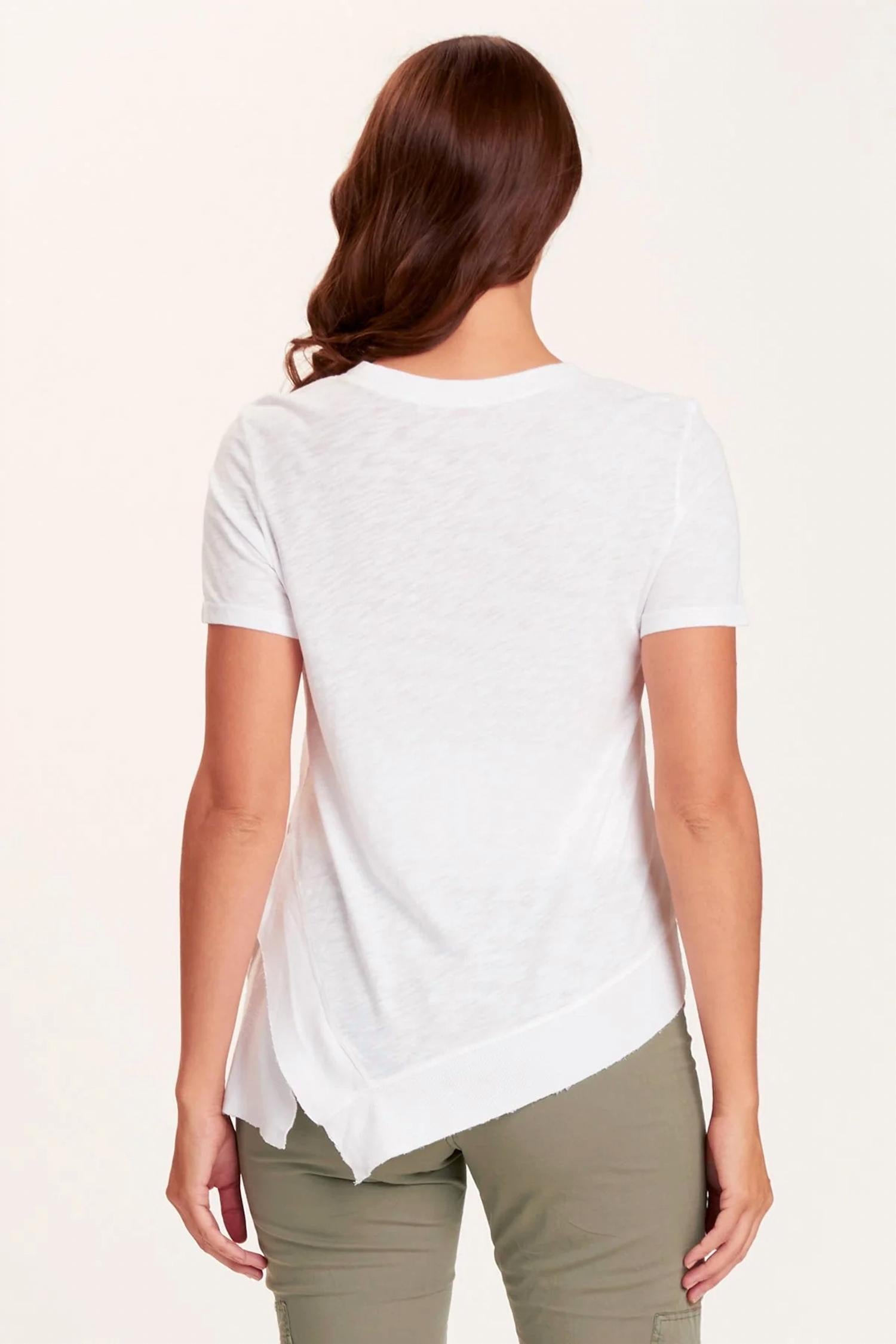 Features a crew neckline, short sleeves, asymmetric hemline with rib detail, and a rib insert on side. Machine washable. Model is 5'10 wearing size Small.