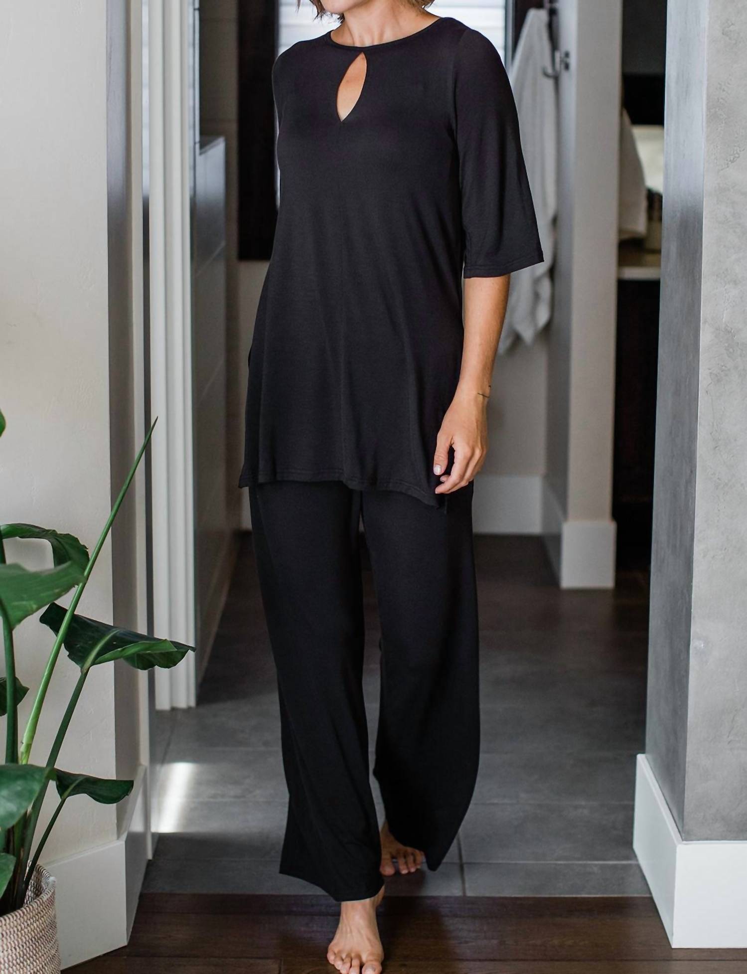 The perfect piece to lounge in, sleep in, and cook breakfast in. Unwind in luxury with the Kat Lounge Bamboo Pajama Set by Yala, inspired by 70's Laurel Canyon charm. This black set features an A-line top with kimono sleeves and a keyhole neckline, while the bottoms offer a comfort waistband and wide legs with a 28" inseam. Crafted from a 95% Viscose (from USDA Certified Organic Bamboo) and 5% Spandex blend, it provides unmatched softness and breathability. Care instructions include machine wash and tumble dry, promising ease in upkeep for this minimalist essential.