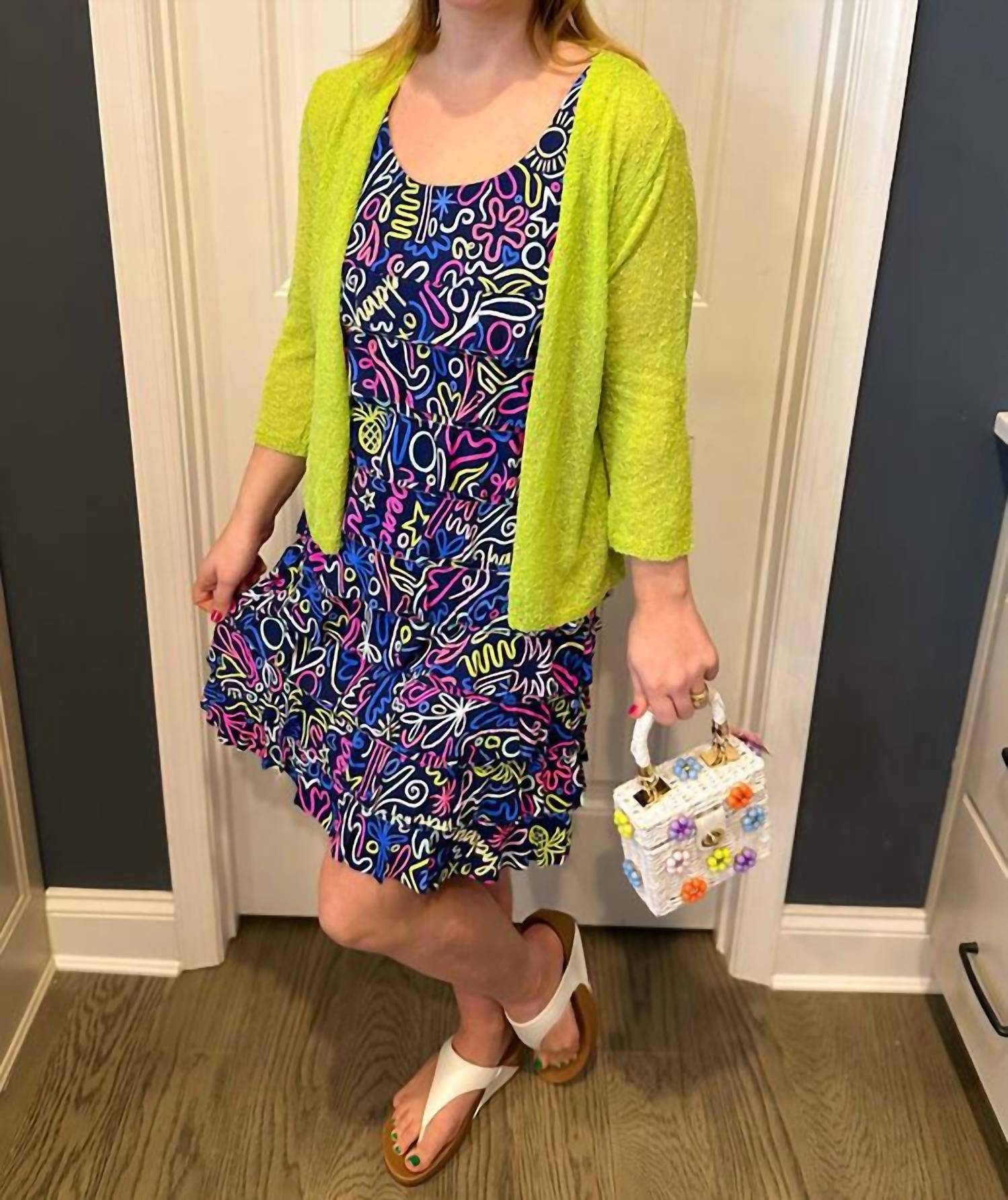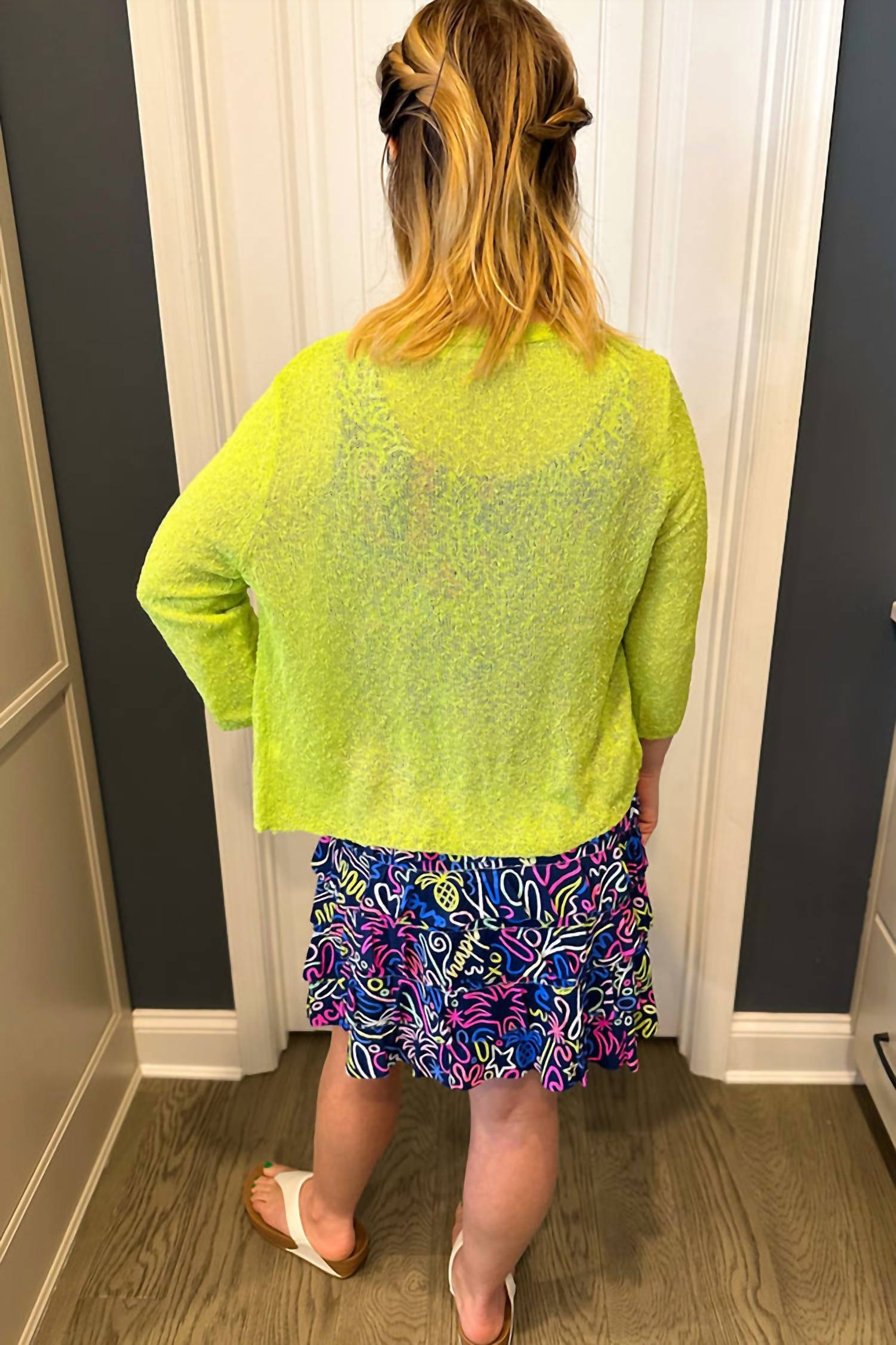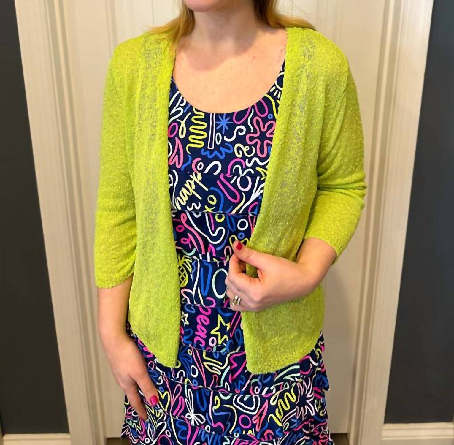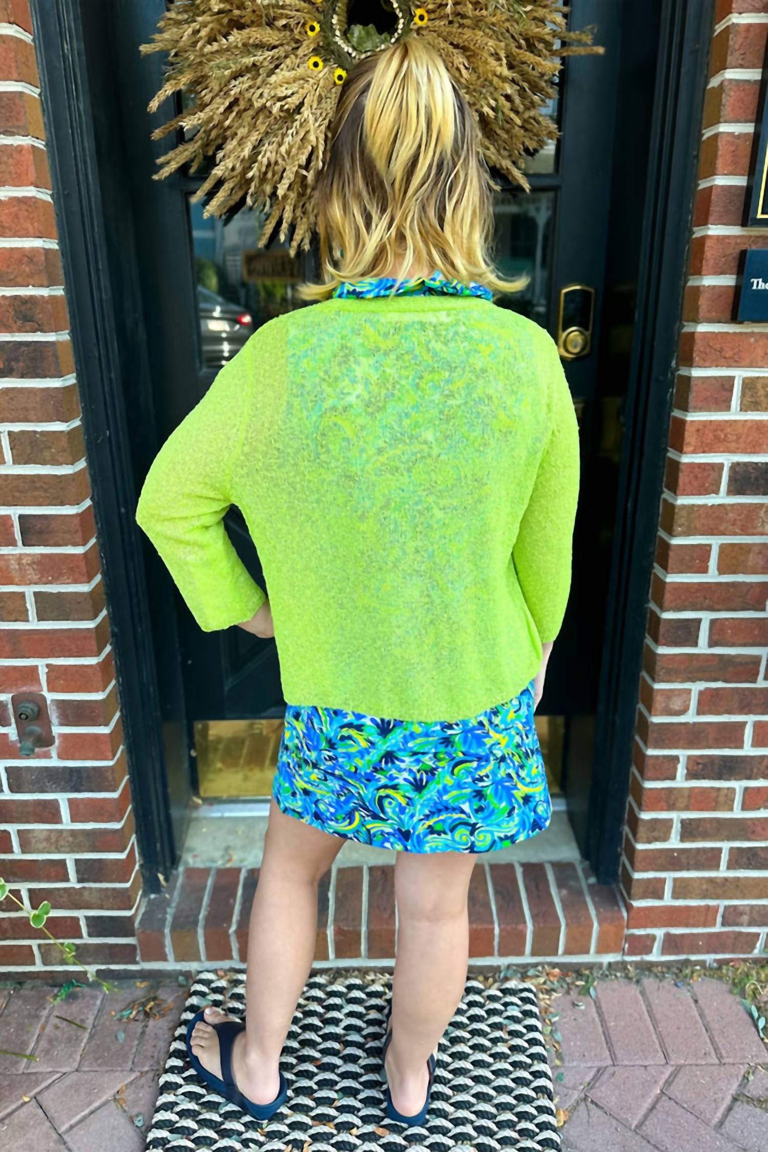 A classic fit that works just as good buttoned as it does left open. Introducing the Lightweight Cardigan by Lulu-B, a chic and practical addition to your fall wardrobe in a vibrant Key Lime hue. This women's cardigan features a textured pattern and three-quarter sleeves, crafted from 75% Polyester and 25% Acrylic. It offers a convenient pull-on closure and is easy to care for with machine wash instructions.