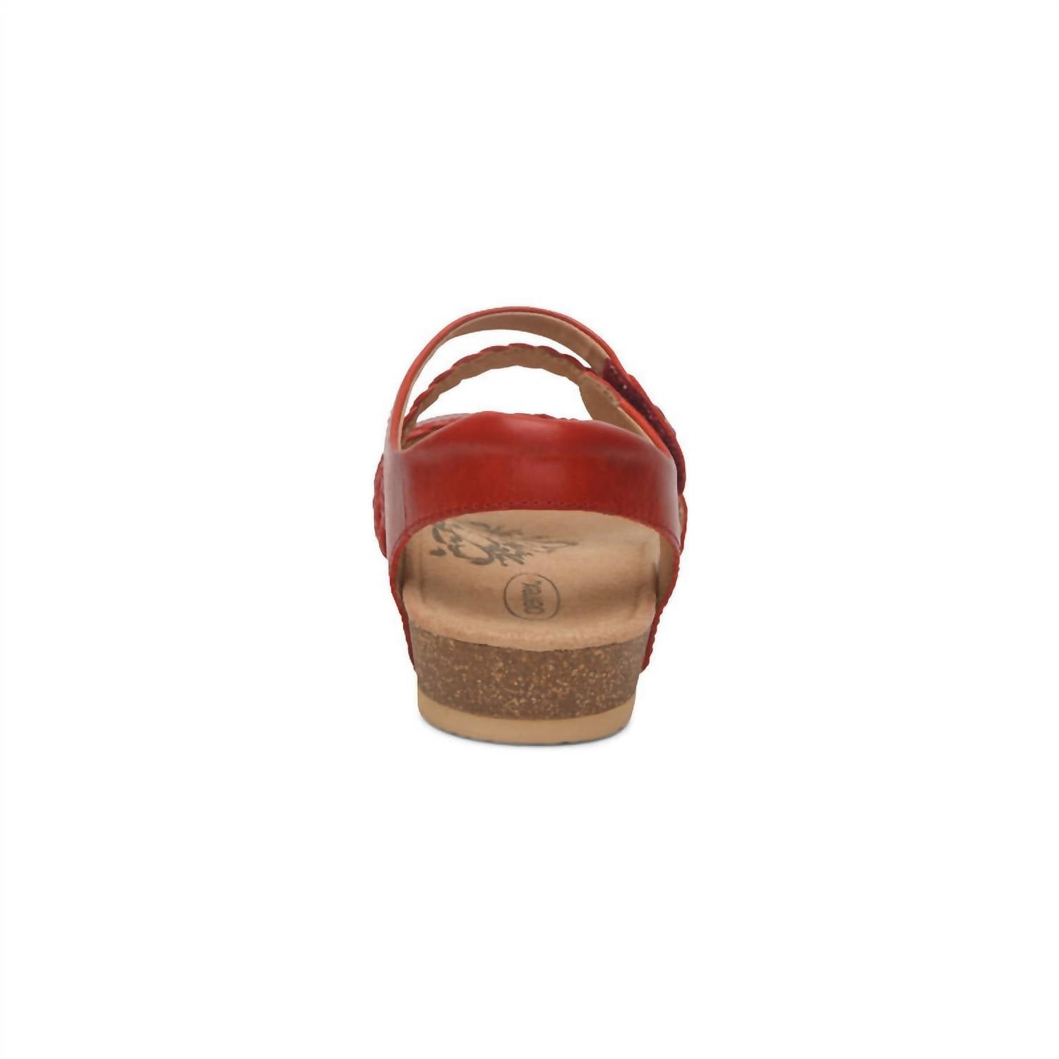 Flowy dresses, cropped pants, and even jumpsuits... this sandal works with them all! The Aetrex Women's Jillian Braided Quarter Strap Sandals in red are a chic addition to your summer wardrobe. Featuring a genuine leather upper and a memory foam footbed with ultra-light cork midsole, they offer unmatched comfort and support. The hook and loop closures ensure a secure fit, while the 1.1" heel provides low-profile elevation. With antimicrobial microfiber lining and a blown rubber outsole, these sandals are ideal for stylish and comfortable wear, whether at church or on holiday adventures.