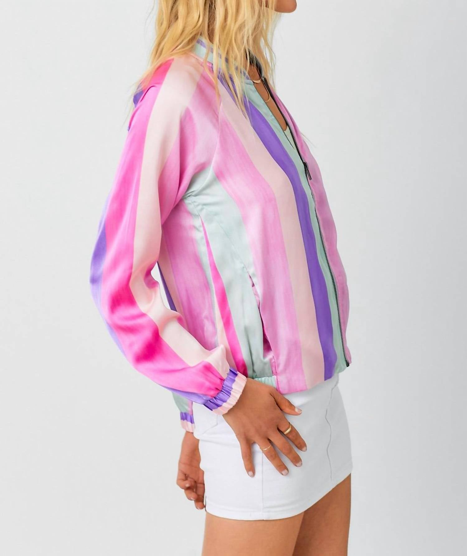Make any outfit instantly cool by pairing it with this bomber jacket. Chic cotton candy long-sleeve bomber. Crafted from high-quality 100% polyester, ensuring durability and comfort. With a zip closure and practical side pockets. Combines style and functionality effortlessly. Raglan sleeves and elastic cuffs provide a relaxed fit.