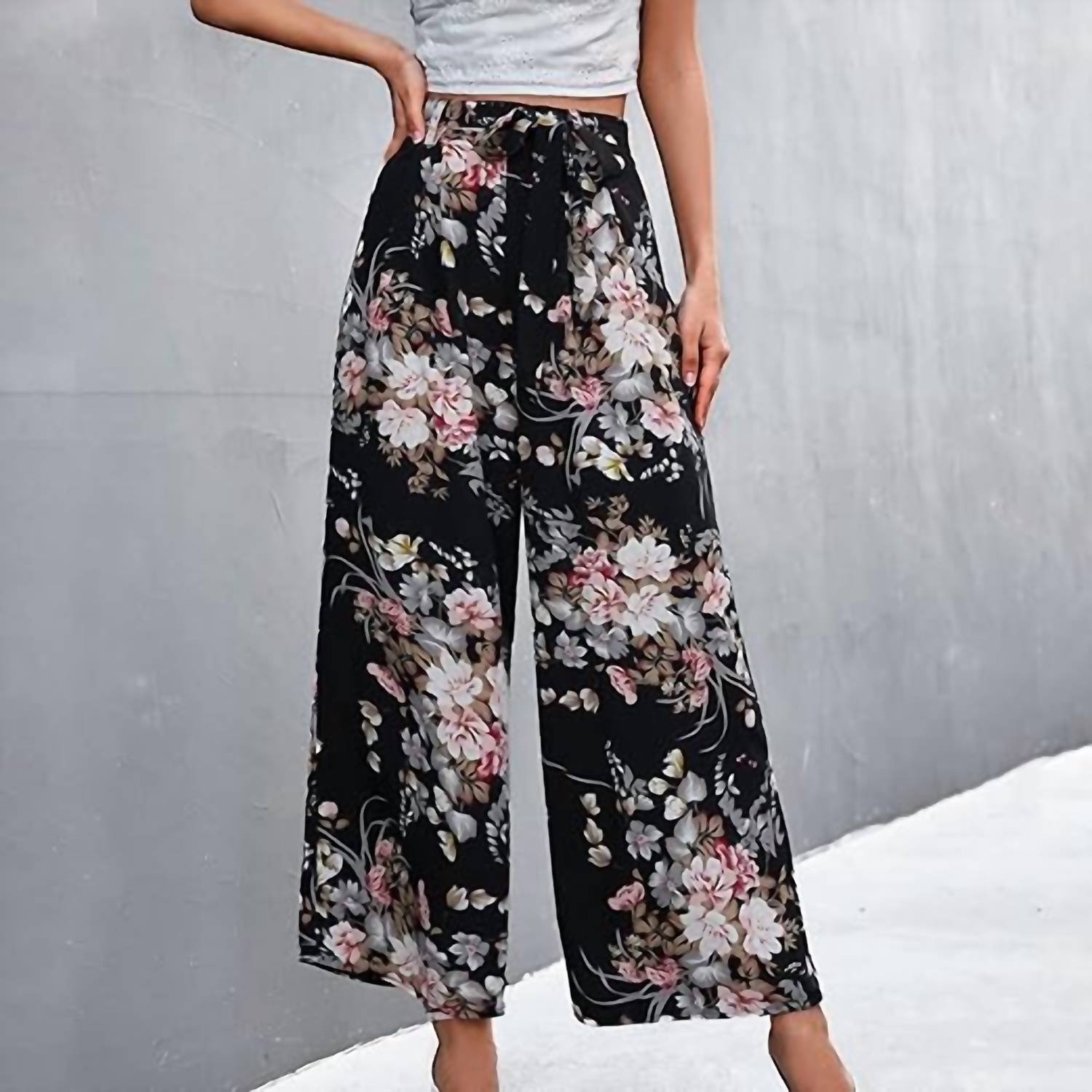 Introducing The Moment Collection's Women's Floral Wide Leg Pant, a chic addition for any wardrobe. Crafted from polyester, these stunning black trousers boast a relaxed fit with a striking floral pattern. Designed with a high-rise waist, they feature a removable belt and convenient side zip closure. Enjoy the practicality of pockets and the ease of a pull-on style, with care instructions that recommend machine washing and tumble drying.