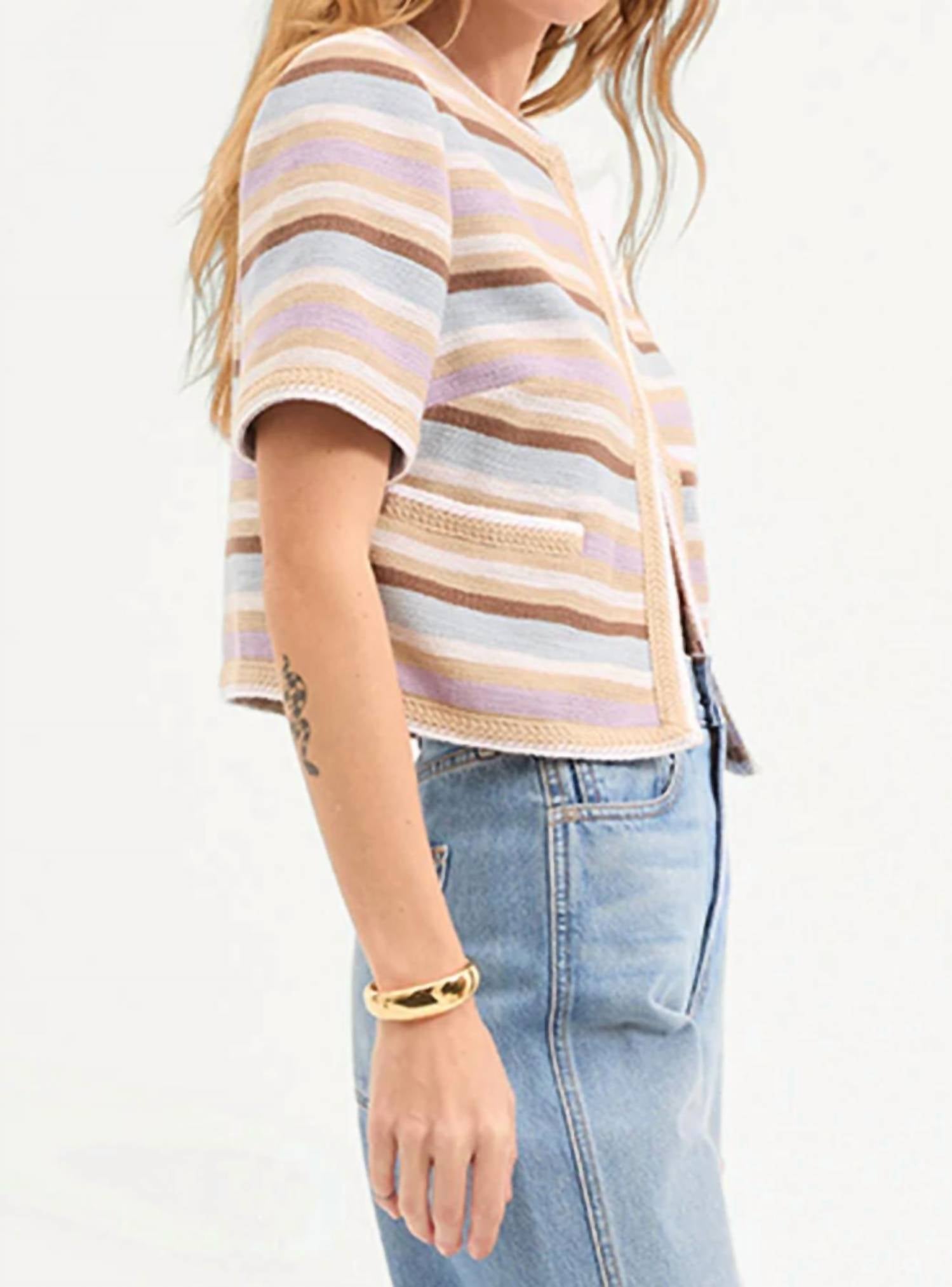Show a little skin in this cute and casual crop top. Experience effortless style with the Veronica Beard Wyatt Jacket in Stone Khaki Multi, perfect for your workwear wardrobe. This cropped top is made from a premium cotton blend, featuring extended short sleeves and a chic crewneck design. With a length of 20.25" and sleeve length of 17.5", it closes with a hidden hook-and-eye, adding a sleek finish to its sun-faded pastel stripes. Material composition is 45% Cotton, 38% Polyester, 17% Viscose with 100% Polyester lining. Care: Dry clean only. Model is 5'10" and wearing size 2.