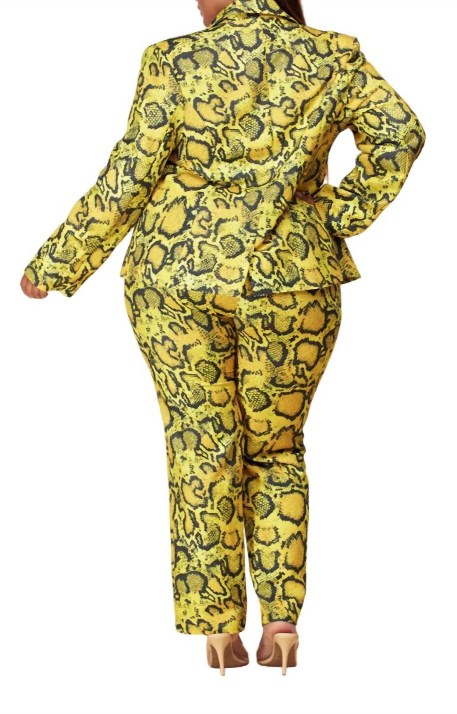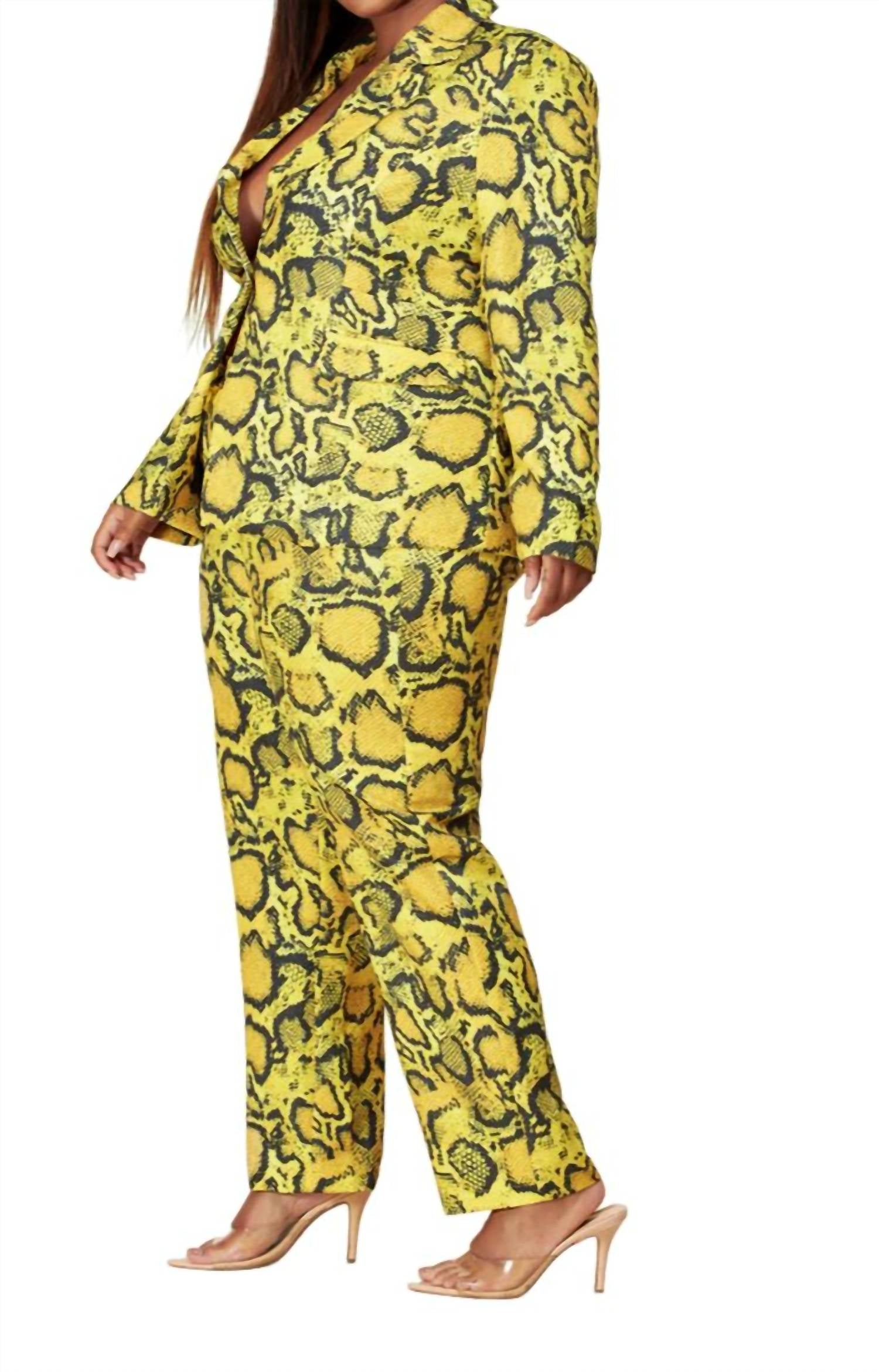 Introducing the Python Pant Set by L'ATISTE, a bold statement in women's suiting. This long sleeve blazer and pant set captures attention with a unique yellow snake print pattern. Featuring a classic collar and practical flap front pockets, the blazer comes with a secure button closure. Perfectly tailored for the confident woman, this set effortlessly combines style and sophistication.