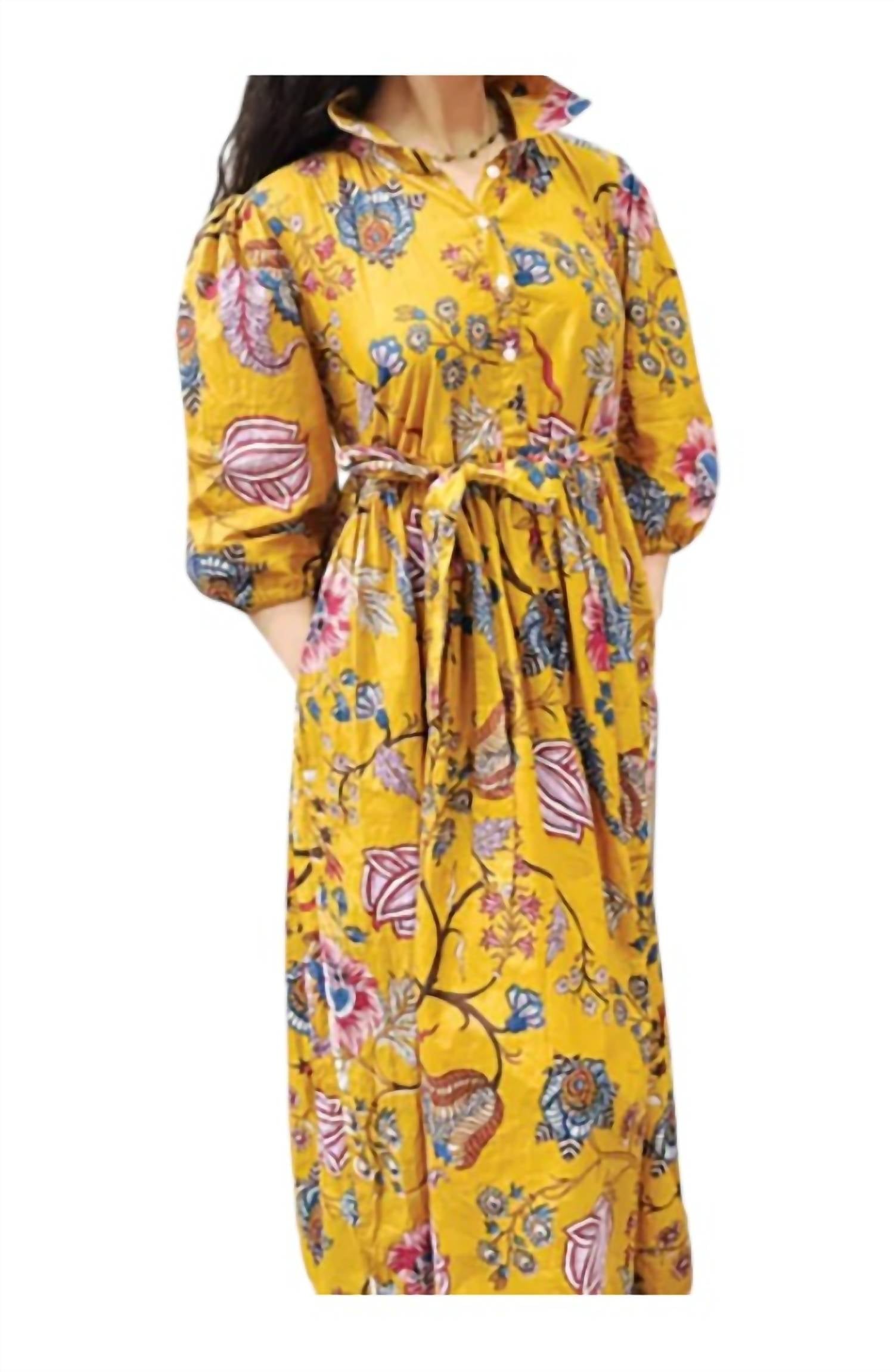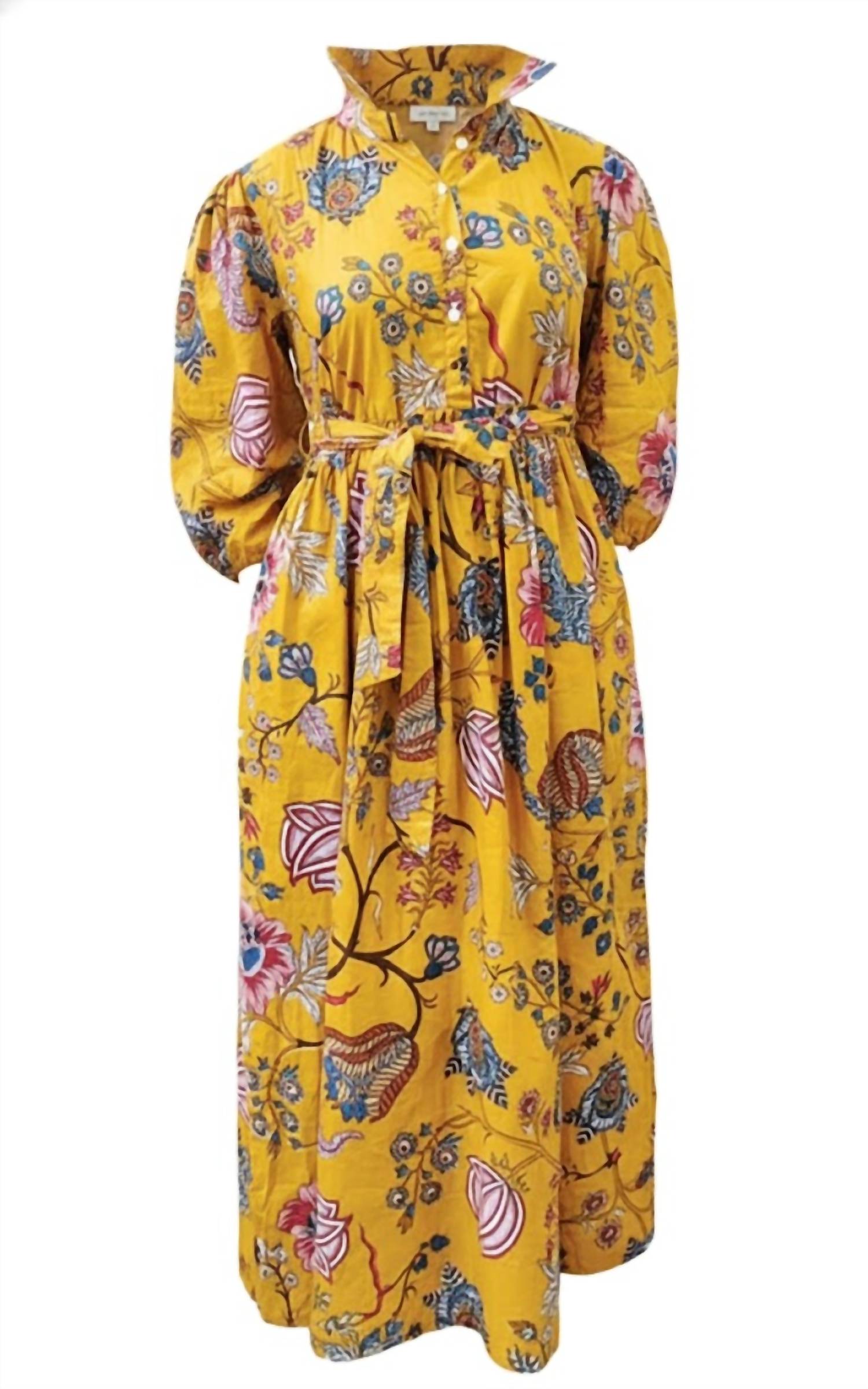 A midi dress so versatile, your options for wearing it are endless. Experience the Maple Midi Dress by Farylina, a perfect blend of sophistication and charm, featuring three-quarter sleeves and crafted from yellow cotton with a maximalist pattern. This A-line silhouette dress with a collared neckline is ideal for a dinner party or Thanksgiving gathering. Closure: Button closure.