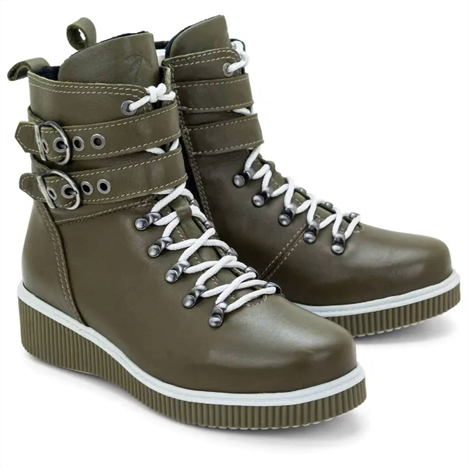 A stylish lace-up boot with a comfortable fit and classic design. Versatile enough to wear with almost every outfit, your closet and feet will be thanking you. Step into comfort and style with the Women's Jessie Boot by DROMEDARIS, crafted from soft tumbled leather in a versatile olive hue. This lace-up boot features metallic eyelets and buckle straps for a trendy look, while the inside zipper ensures easy entry. Enjoy the exclusive thermoplastic rubber ribbed outsole, paired with a rocker bottom and wedge heel for enhanced stability. Lined with soft faux fur, it includes Dromedaris 4D Komfort Footbeds, offering arch support and shock absorption for all-day comfort.