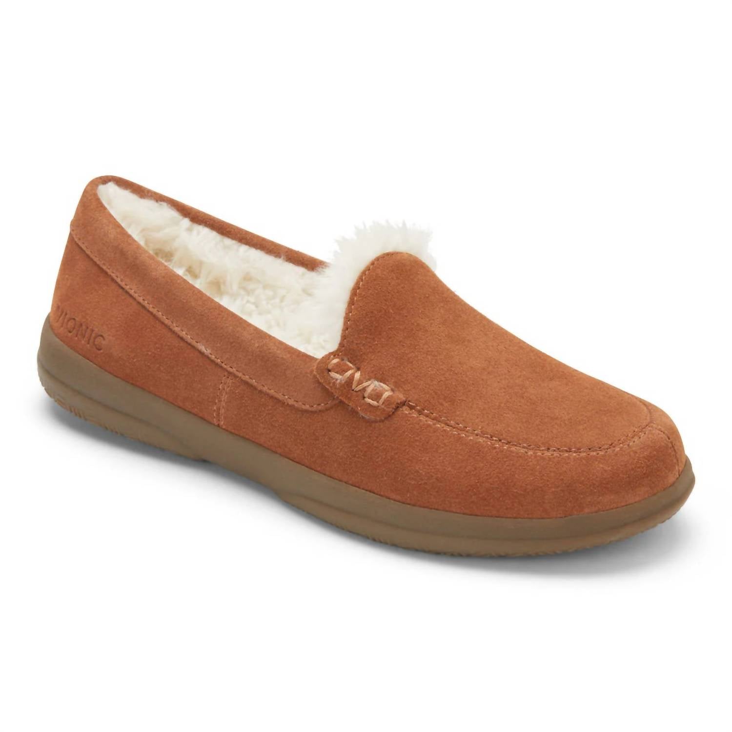 Slip into these, we promise you won't regret it. The Vionic Women's Lynez Slippers in Toffee offer both comfort and style with their suede upper and soft faux fur lining, perfect for any occasion. Designed for both indoor and outdoor use, these slippers feature a durable rubber outsole and a comfortable 1-inch flat heel. The casual moccasin style with a round toe gives a vintage flair, ideal for fall getaways or lounging. Enjoy the blend of a man-made footbed with the cozy feel that VIONIC is known for.