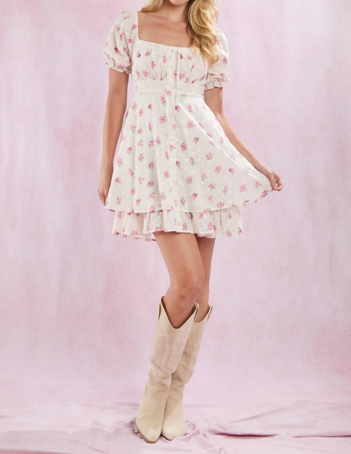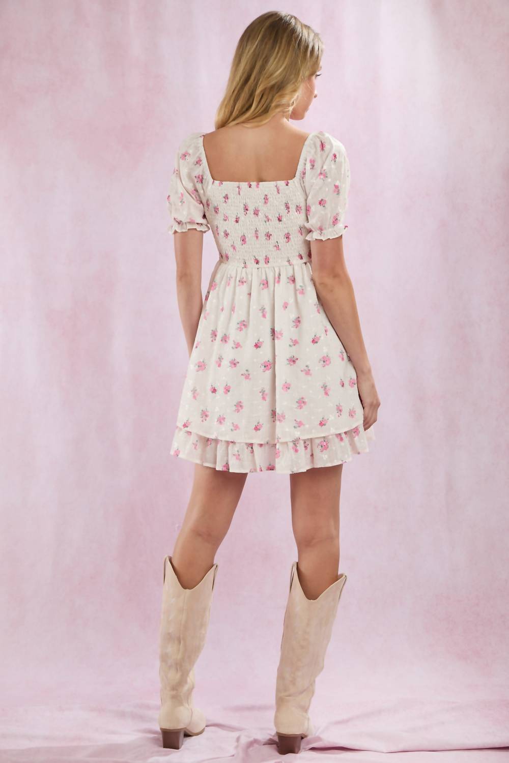 The perfect mini dress for those warmer months. Introducing the Sienna Rose Mini Dress by Peach Love, a chic addition to your wardrobe with its graphic pattern and playful A-line silhouette. This dress features short sleeves and a trendy squareneck for a flattering look. Closure: Pull on. Care: Line dry. Model is wearing a size small (5'9" height, 34" bust, 25.5" waist, 37.5" hips).