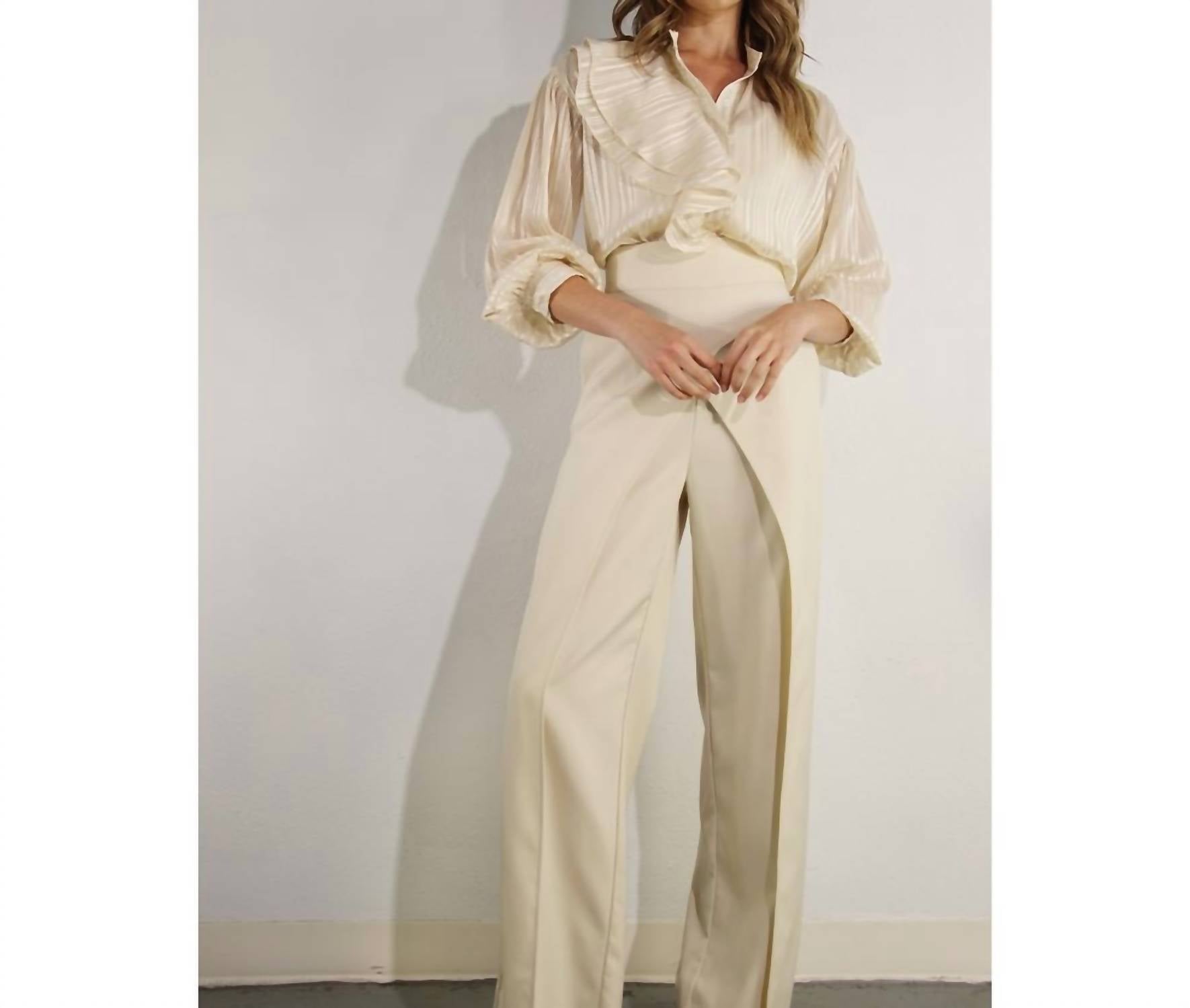 Discover the Fly Away With Back Tie Pants by Mulla, crafted from 100% Cotton for a comfortable and stylish fit. These cream wide-leg pants feature a unique front overlap layered design and a fashionable back lace-up detail. With convenient side pockets and a solid pattern, they are perfect for a workwear look. Made in China, these pants require hand washing.