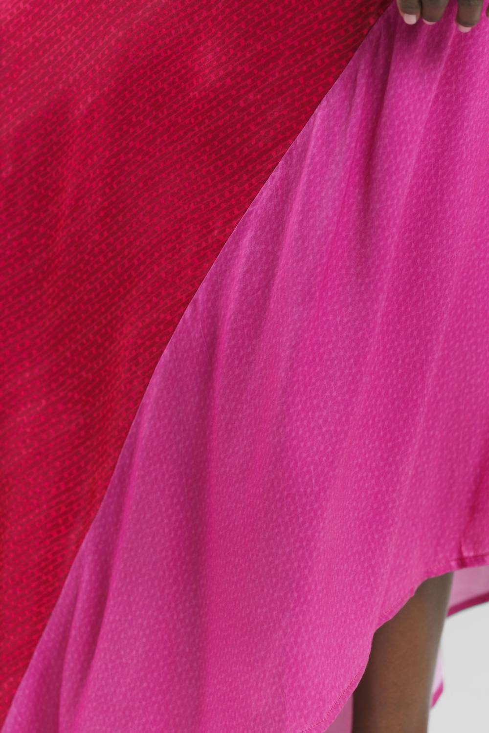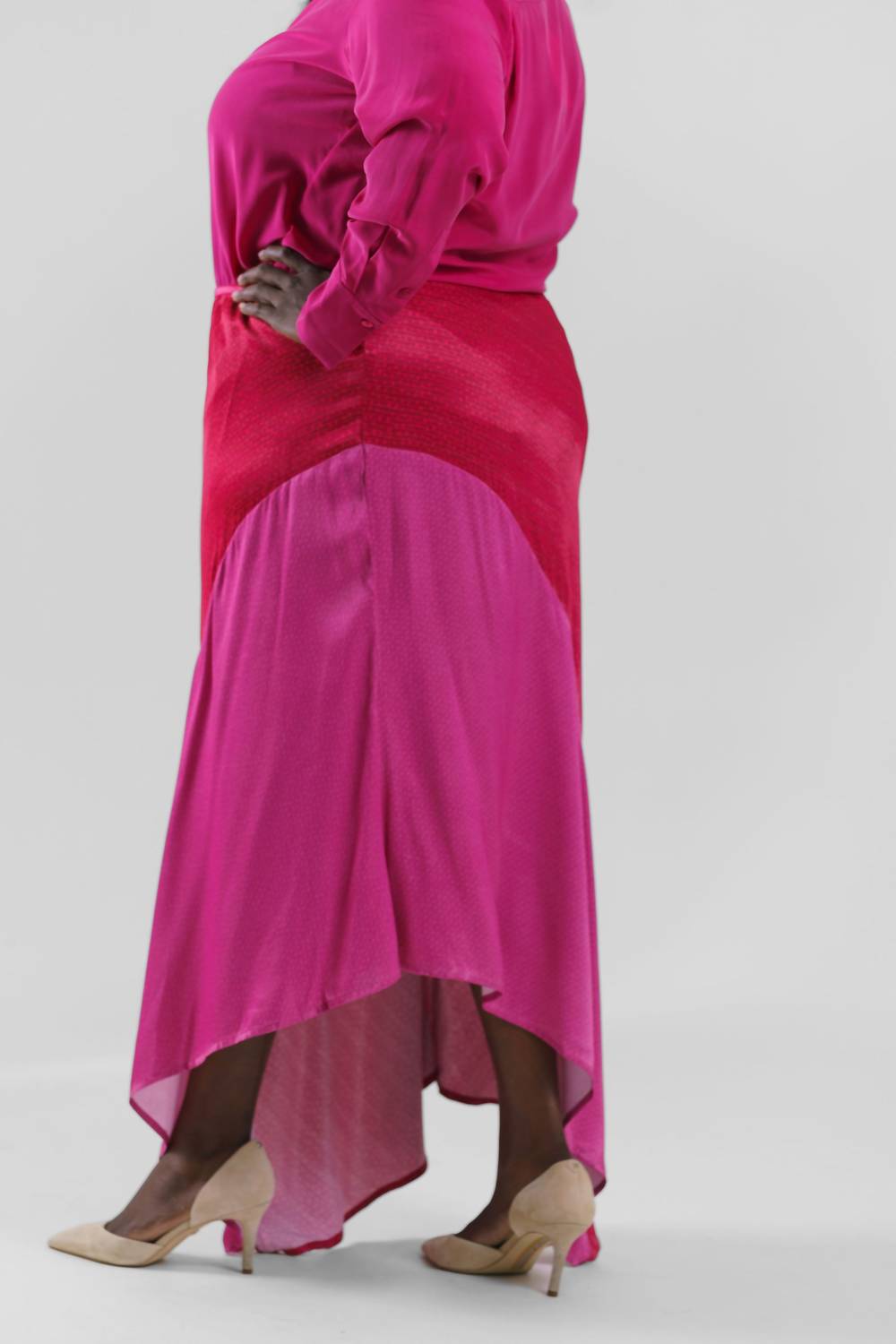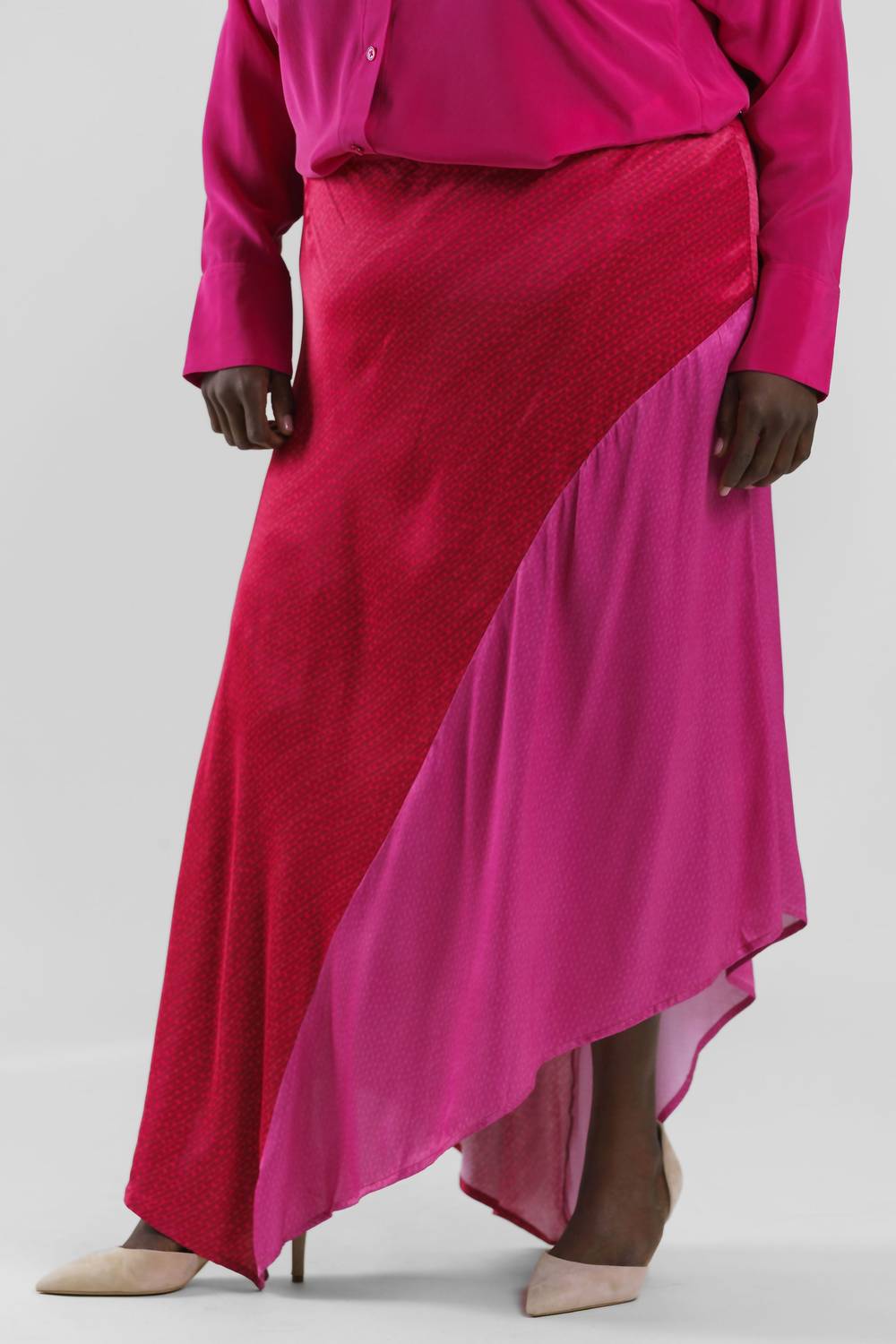 Who doesn't love a good maxi skirt? Enhance your fall wardrobe with the Angela Skirt by -bl^nk-, a stunning piece in vibrant red and pink. Crafted from textured viscose, this plus-size skirt offers a mid-length drape that complements any evening event or Thanksgiving gathering. Featuring a pull-on closure for effortless elegance, it pairs beautifully with kitten heels for a dash of glamour. Care: Hand wash and line dry to maintain its vibrant color and soft texture.