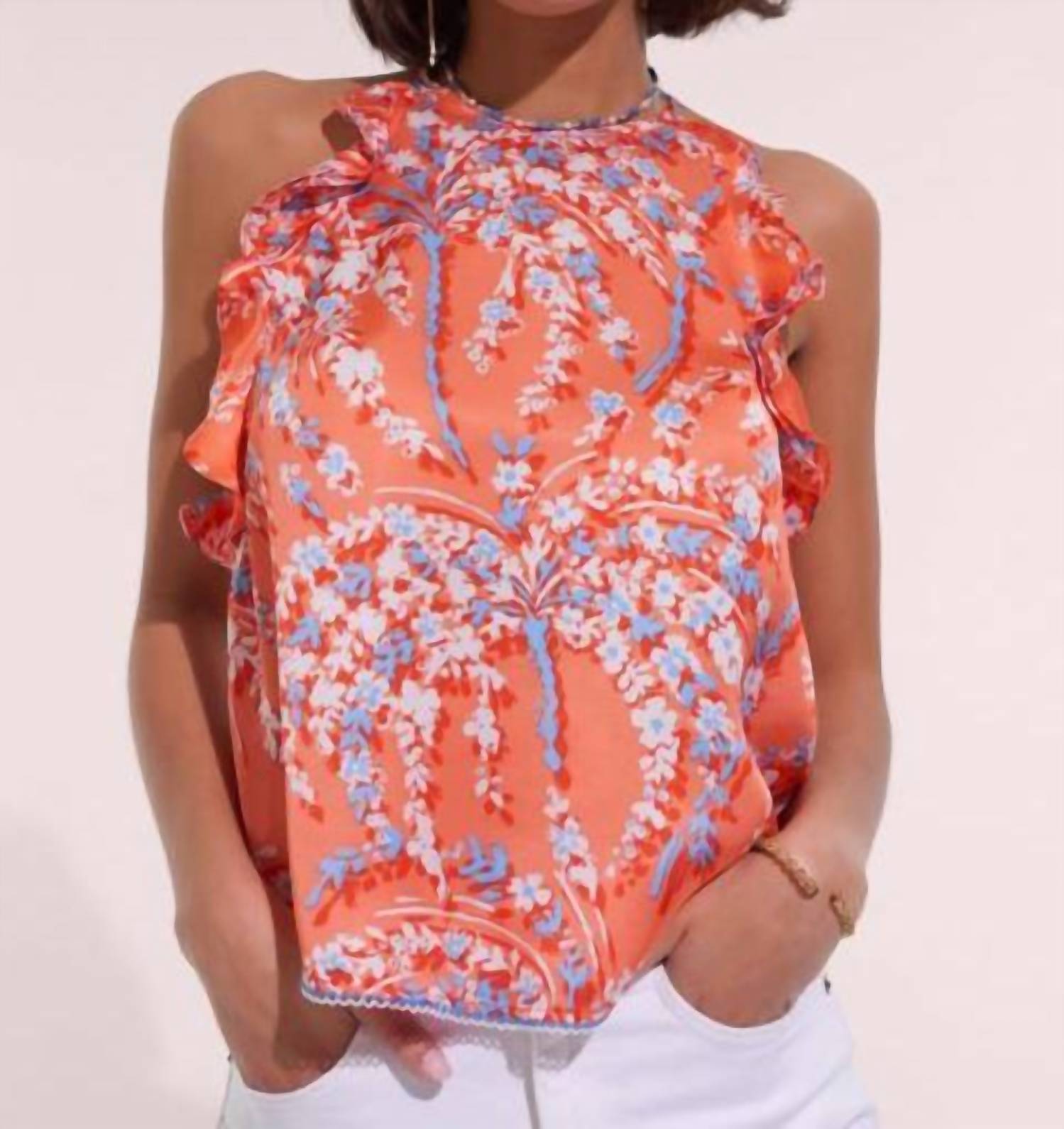 Pair this with your favorite jeans and slides for your next girls night out. Introducing the Alida Sleeveless Top by Poupette St Barth, a vibrant addition to your wardrobe in the striking Orange Palmery print. This blouse features a charming floral pattern and ruffled trim, complete with a crewneck for a delicate touch. Crafted from 100% viscose with a back loop button closure, it exudes effortless chic. Made in Indonesia, this piece requires hand washing to maintain its quality.