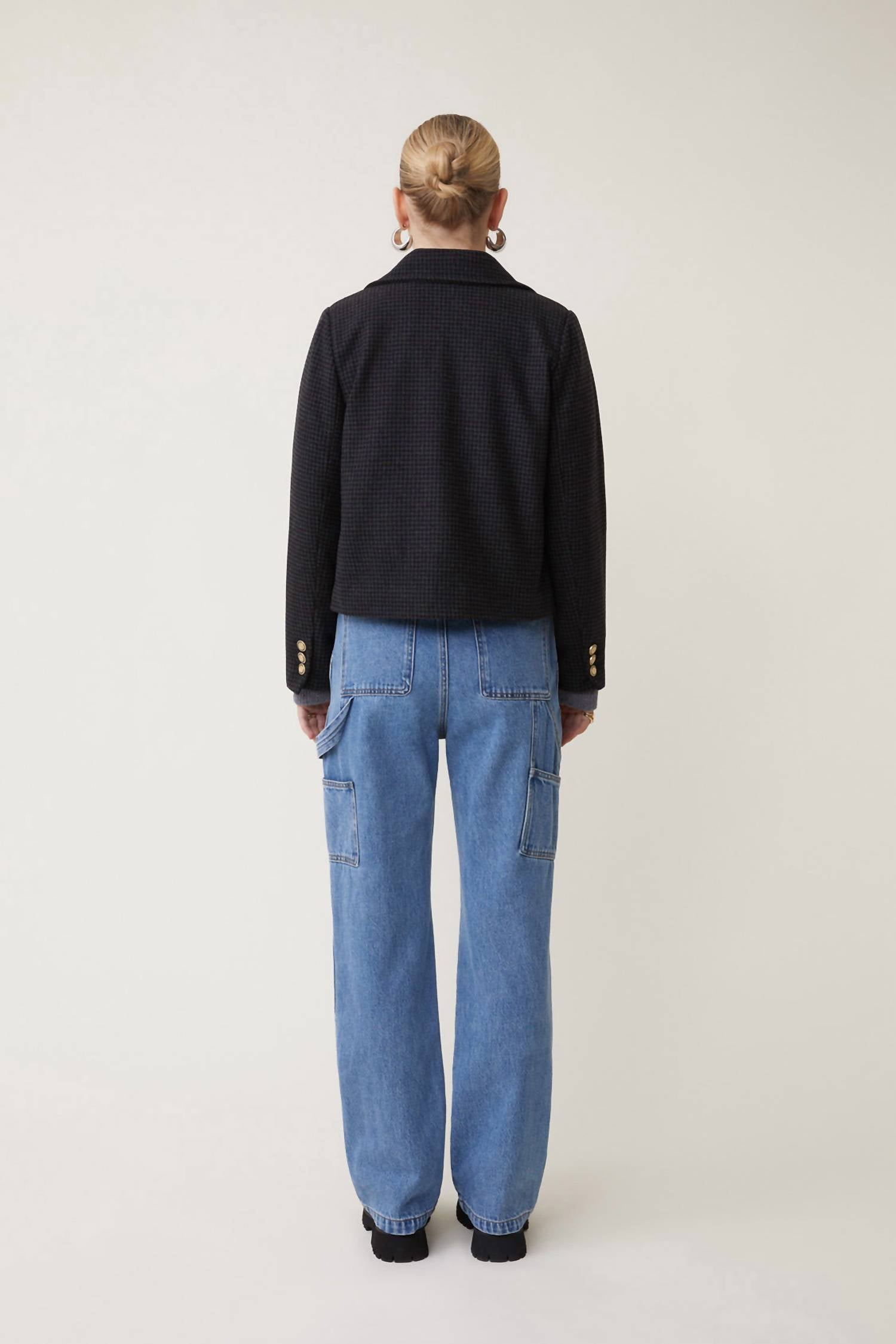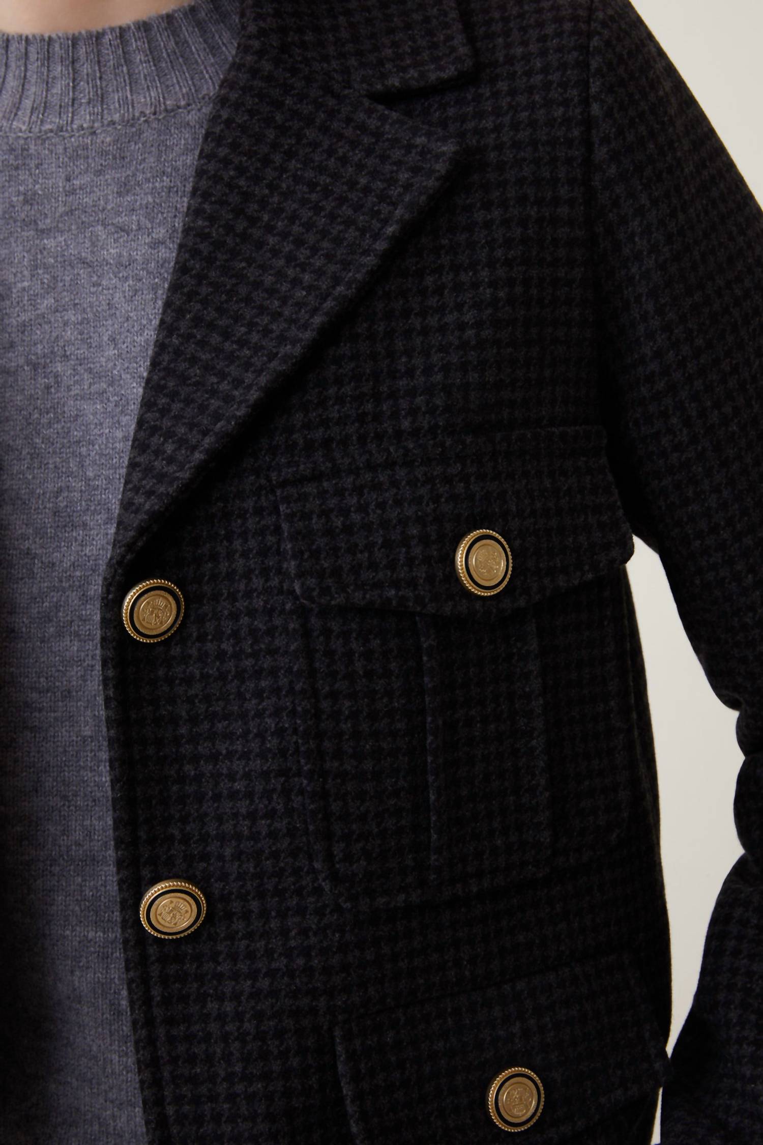 A blazer so versatile you can wear it to the office or pair it with jeans for a more casual look. Elevate your wardrobe with the Darcy Blazer Jacket by Suncoo in classic black with a chic plaid & check pattern. This wool blend piece features long sleeves, golden button detailing, and two functional breast pockets, exuding timeless sophistication. Crafted from 50% recycled wool and 45% recycled polyester, it is fully lined with 100% polyester for added comfort. Closure: Button closure. Care: Dry clean only.