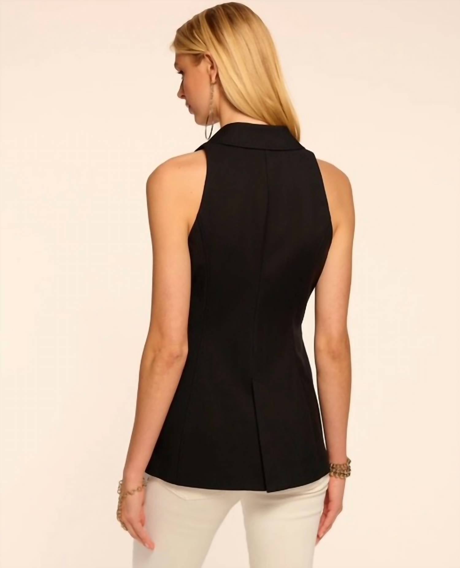 Throw this vest over an all black outfit for a perfectly polished look. Refined yet versatile, the Lisa features a stretch cotton design with a tailored, sleeveless silhouette. Functional pockets, a button-front closure, and a flattering collar make this a layering essential for both casual and workwear looks. Front button closure Peaked lapels Front flap-patch pockets Cutaway shoulders Back slit Lined 60% cotton, 37% nylon, 3% spandex Dry clean