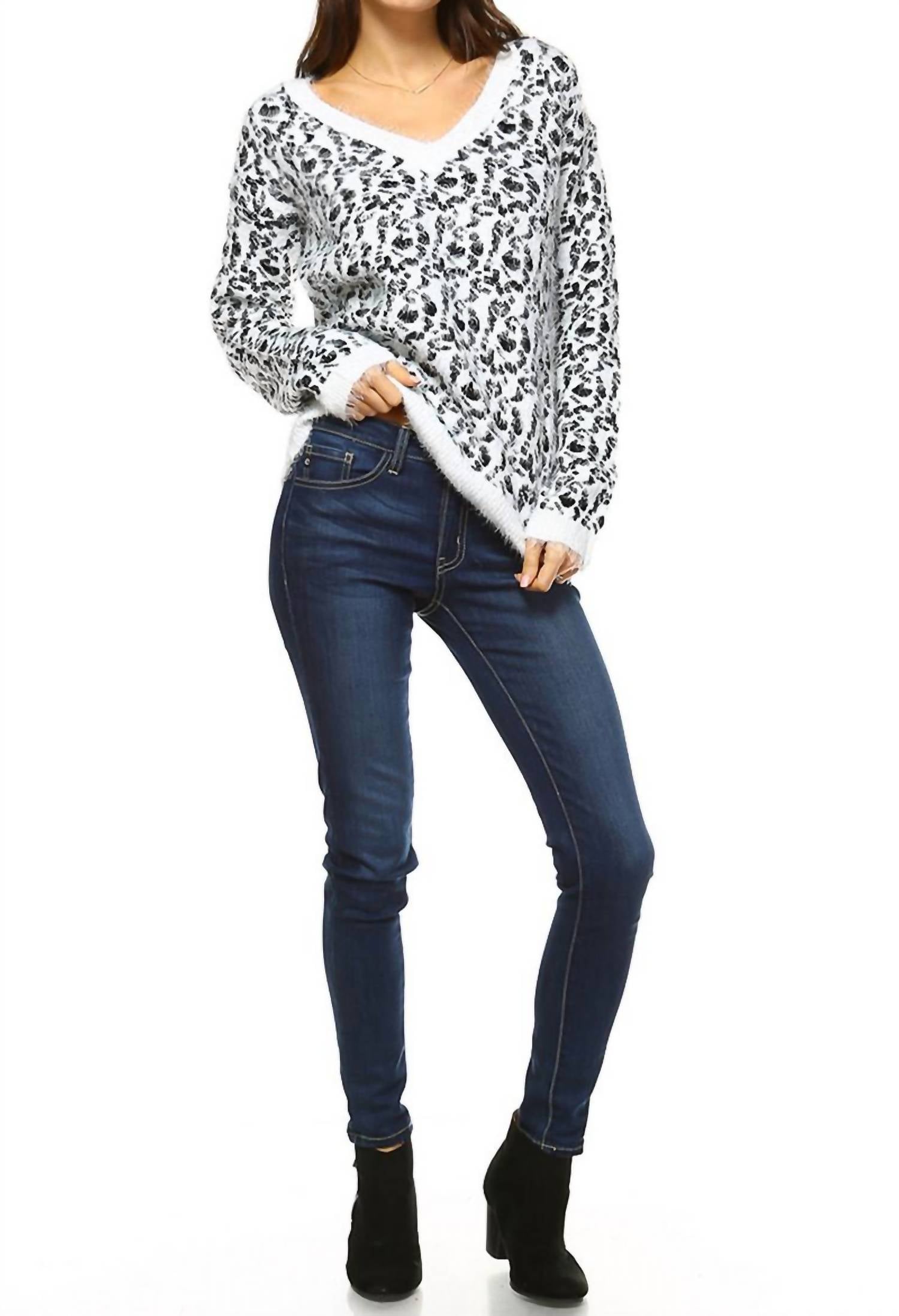 This limited edition angora-like leopard sweater will inject a playful edge into off-duty outfits. The soft color tones in this leopard-print sweater works particularly well with mid-wash denim.