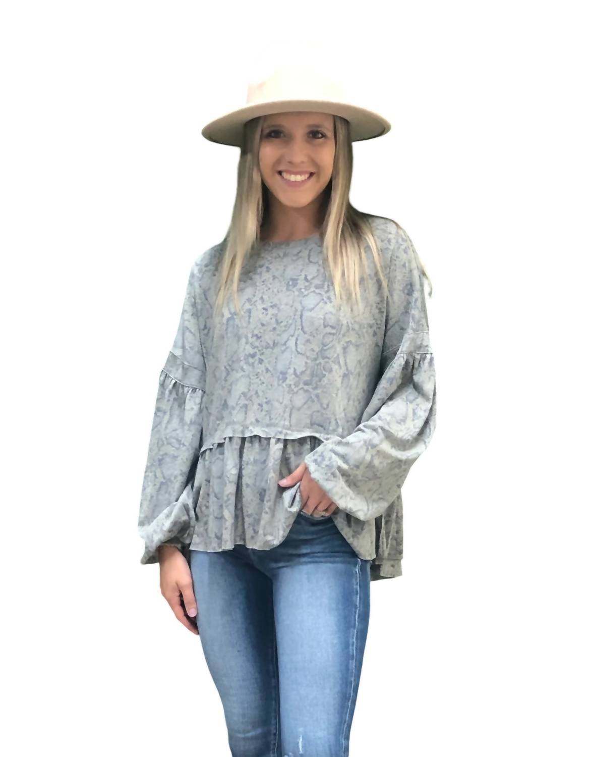 Pair this with your favorite jeans and slides for your next girls night out. Features a round neck and is finished with long puff sleeves and a ruffled hem for a feminine touch.