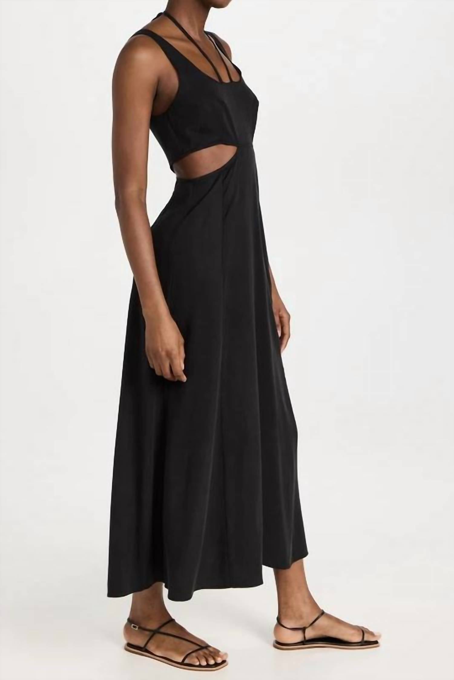 Style this maxi with your favorite statement necklace and sandals for the perfect look. Discover the Lorelei Dress by LNA, a sleek maxi dress in a deep Pirate Black hue designed to make a statement at any dinner party. This sleeveless piece is crafted from 100% Lyocell, featuring an elegant scoopneck and an A-line silhouette that channels 90s fashion. The dress boasts a sophisticated tie closure, adding a touch of charm to its solid pattern. Care is easy with machine washing, making it a practical yet stylish addition to your spring wardrobe.