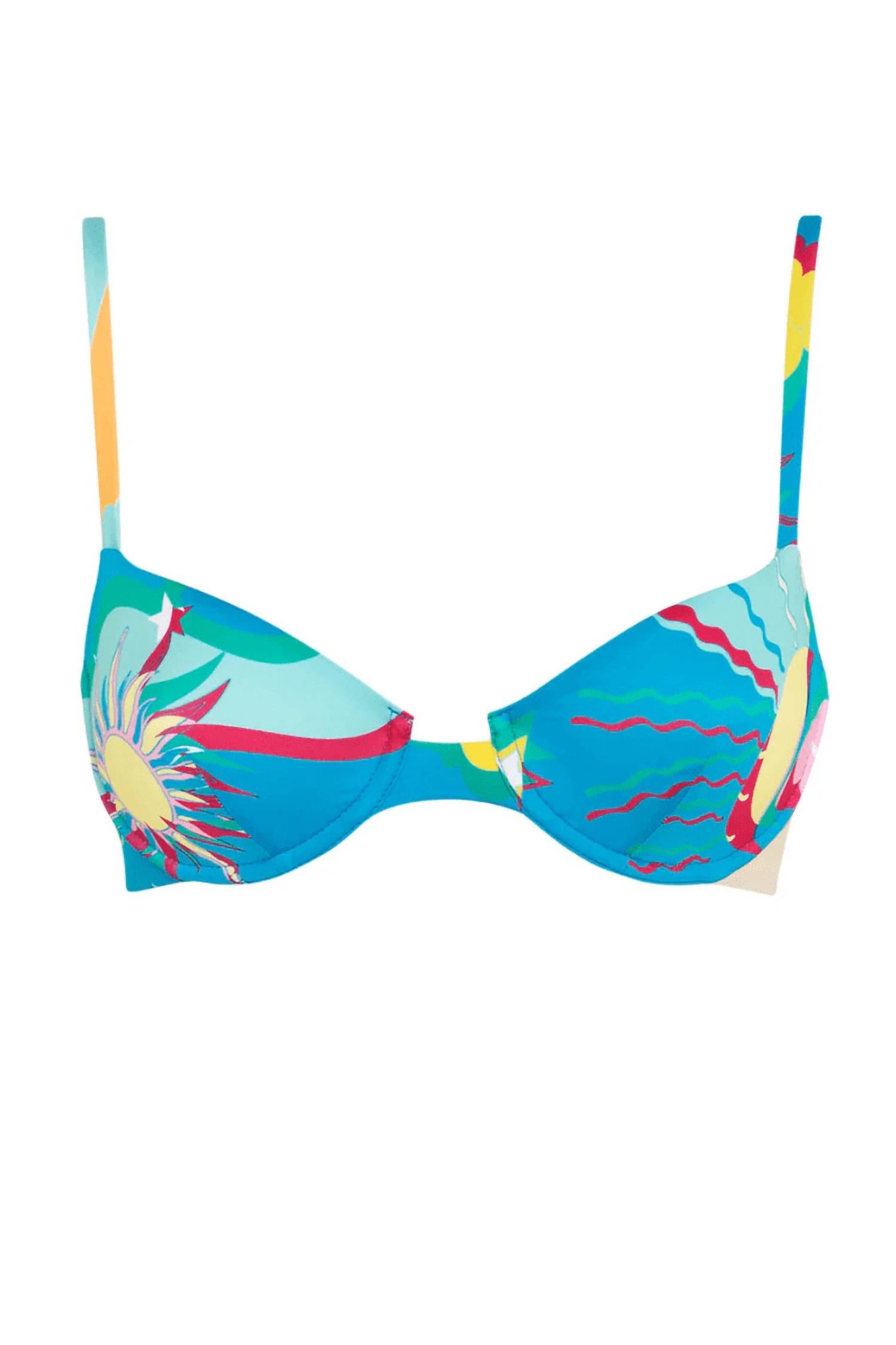 Ideal for relaxed poolside moments, this adorable swimsuit effortlessly transitions into the perfect sunset dinner outfit when paired with a flowing skirt. Experience ultimate beach-ready style with the Astroelevator Orion Bikini Top by Paolita in Blue Multi. This women’s demi swim top blends comfort with contemporary flair, featuring underwired cups and a plunging cutaway front for a flattering, supportive fit. Designed with adjustable straps for a personalized style, this graphic-patterned top offers cheeky coverage. Plus, it's easy to maintain—simply hand wash and enjoy. Ideal for a trendy Y2K summer beach day.