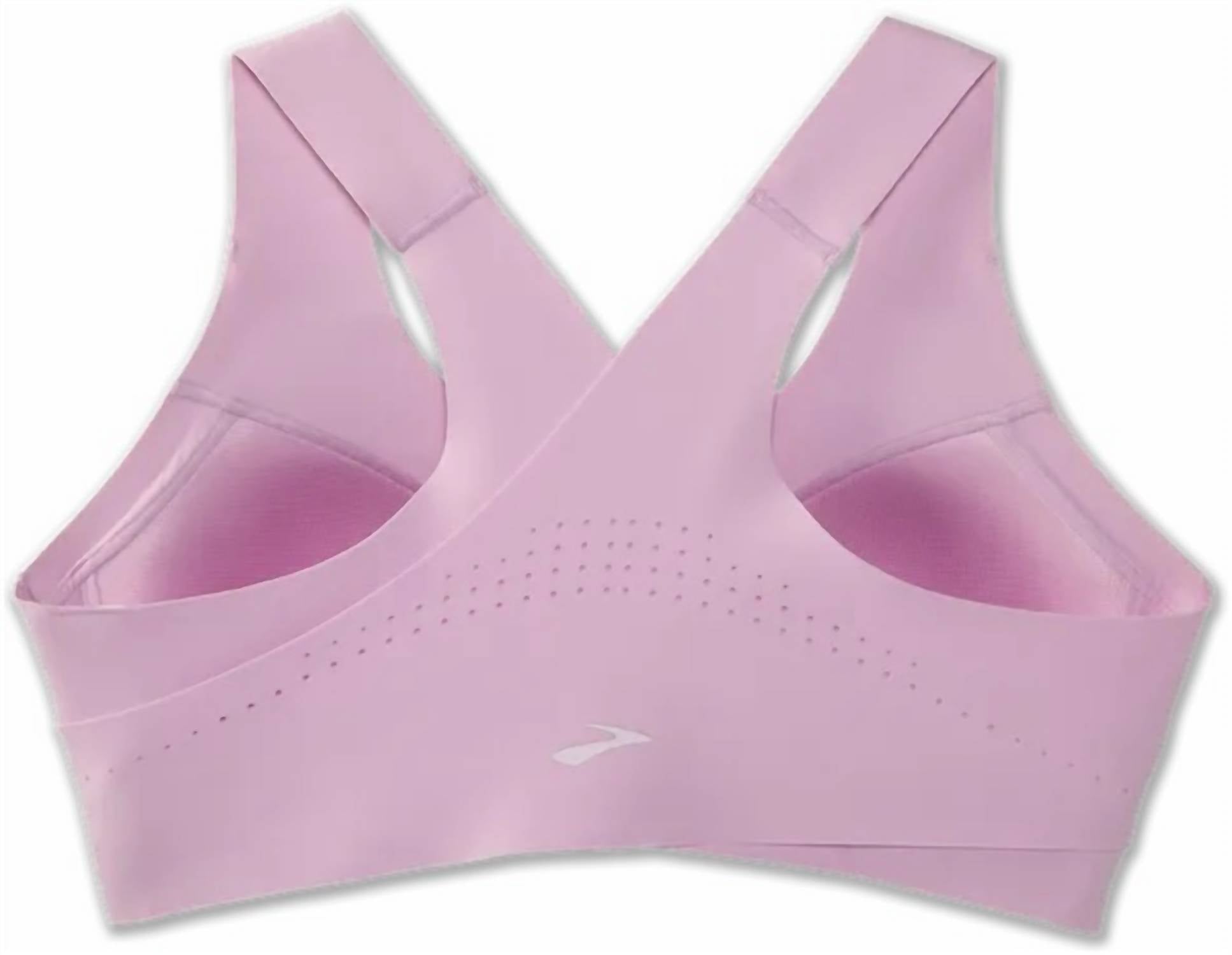 A sports bra that has it all - style, function and support. Presenting the Dare Crossback Sports Bra by Brooks in a striking Orchid hue, perfect for high-intensity workouts and athleisure fashion. This sleek pullover bra features a crossback design with built-in molded cups for superior support and lift. Made from a DriLayer HorsePower Spacer blend of 63% nylon and 37% spandex in the body, and 100% polyester in the cups, it ensures both comfort and performance. Its encapsulation support and integrated bottom band offer invisible support, while strategically placed perforations provide essential ventilation.