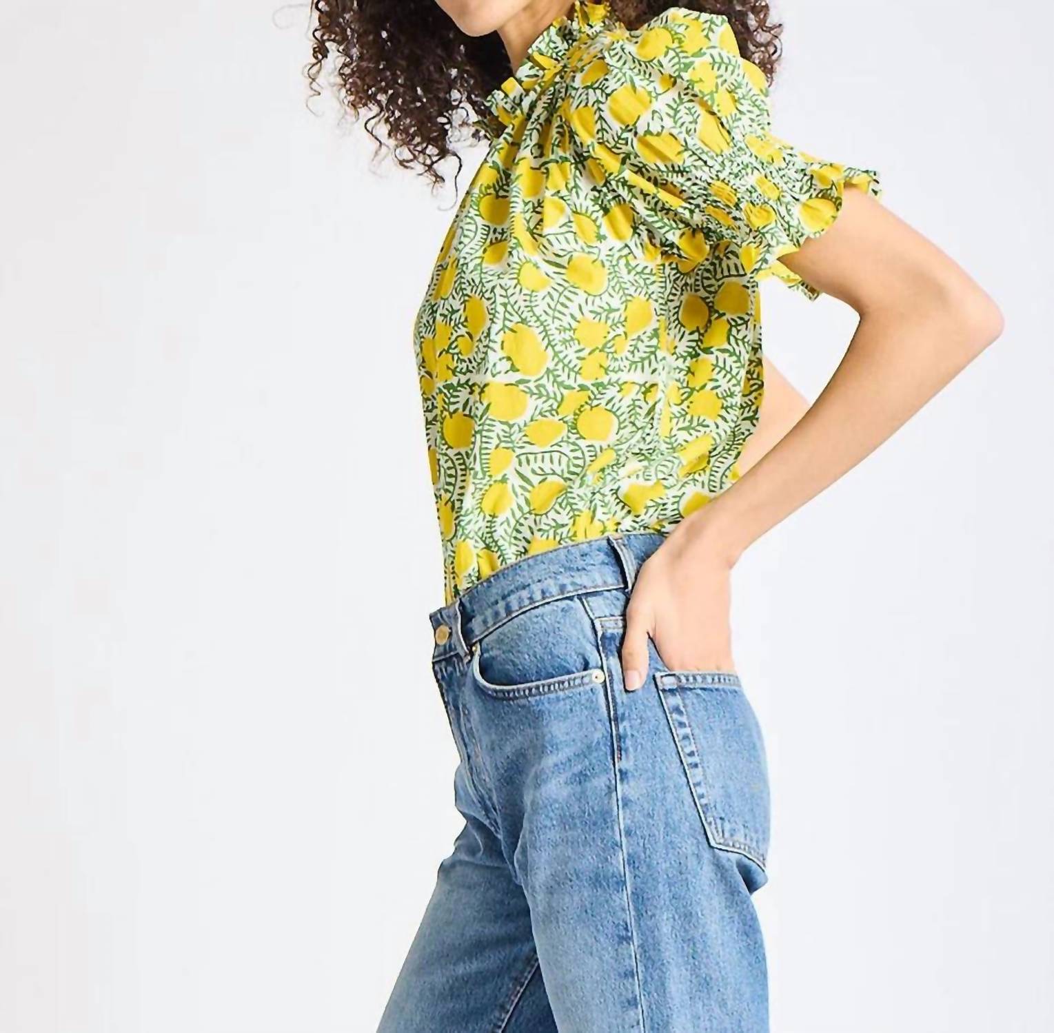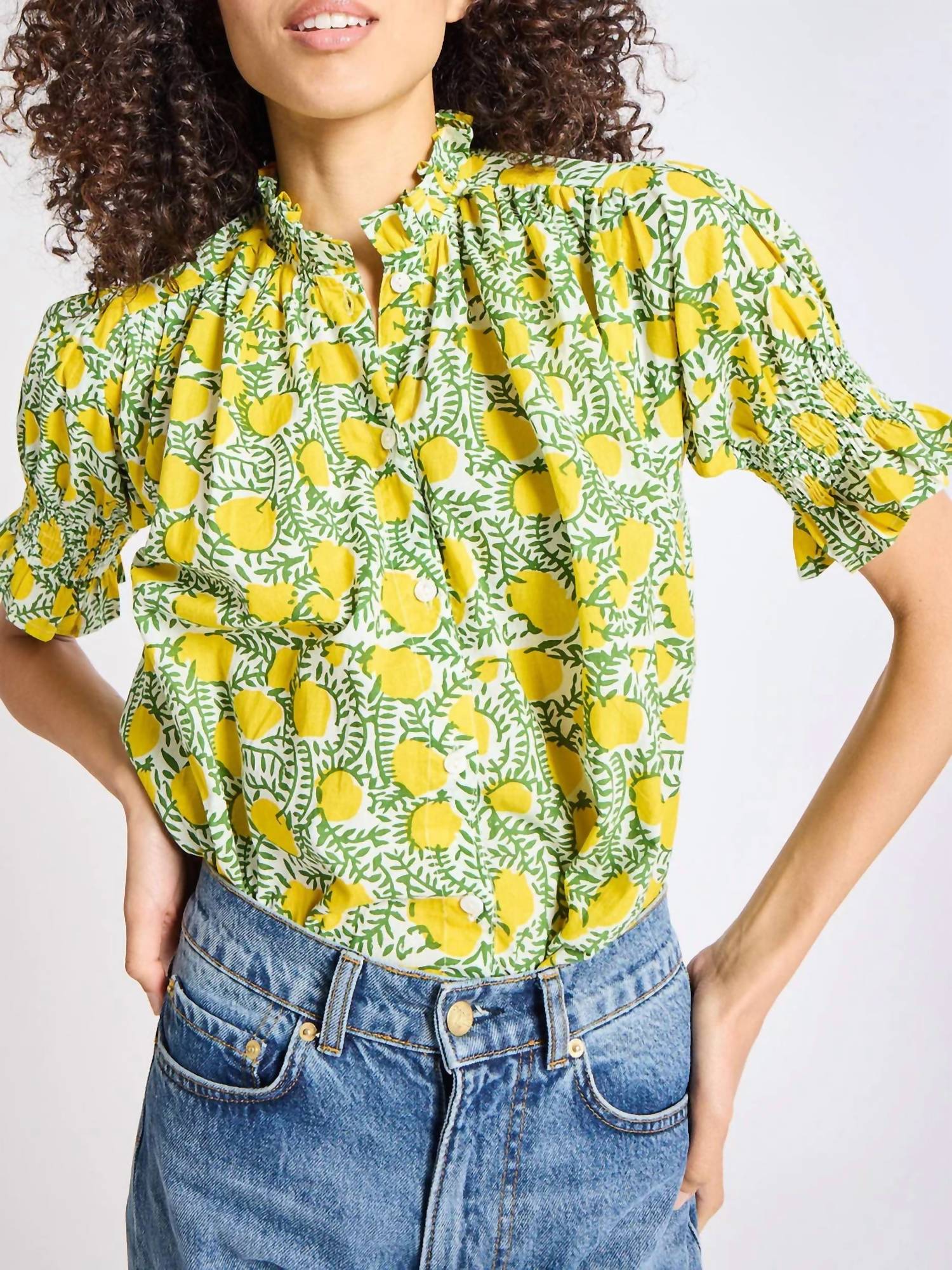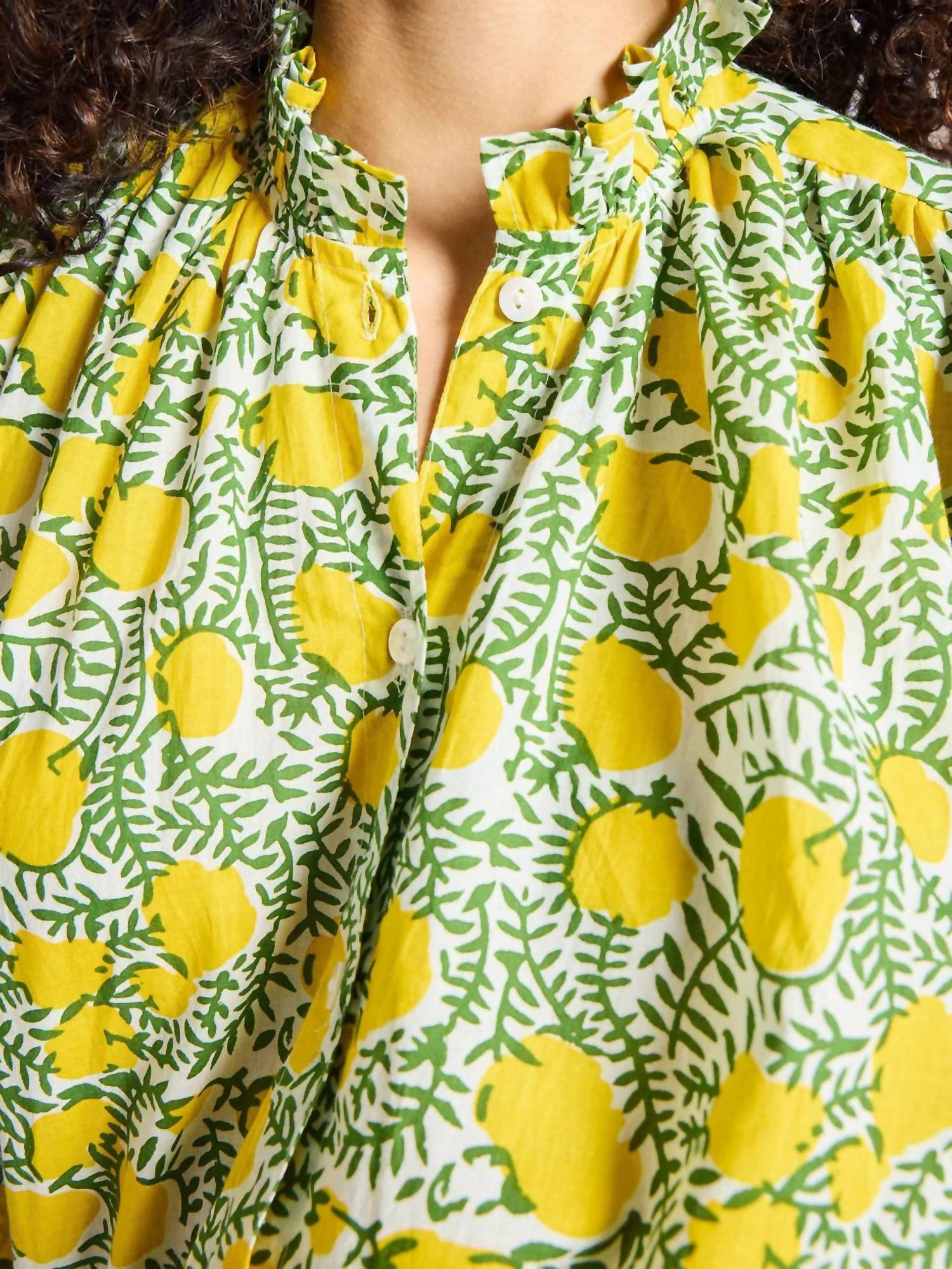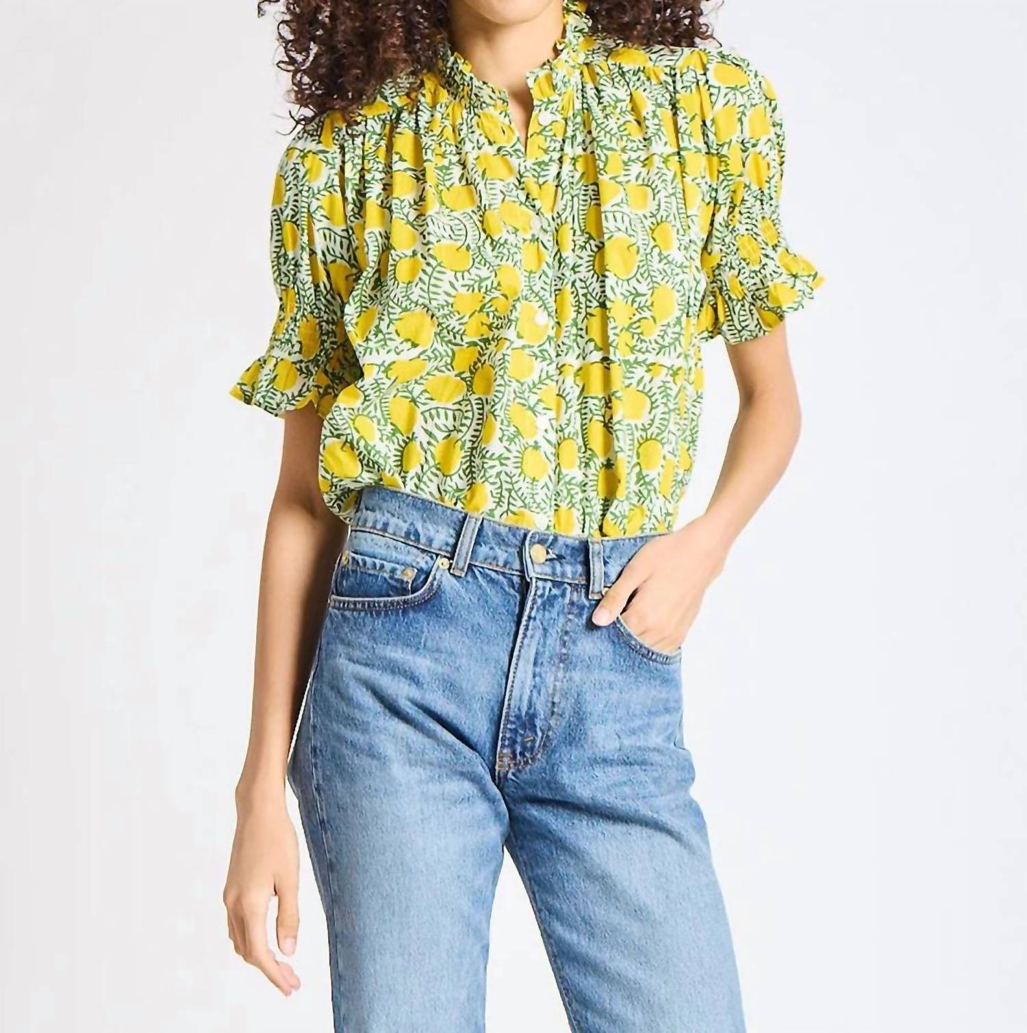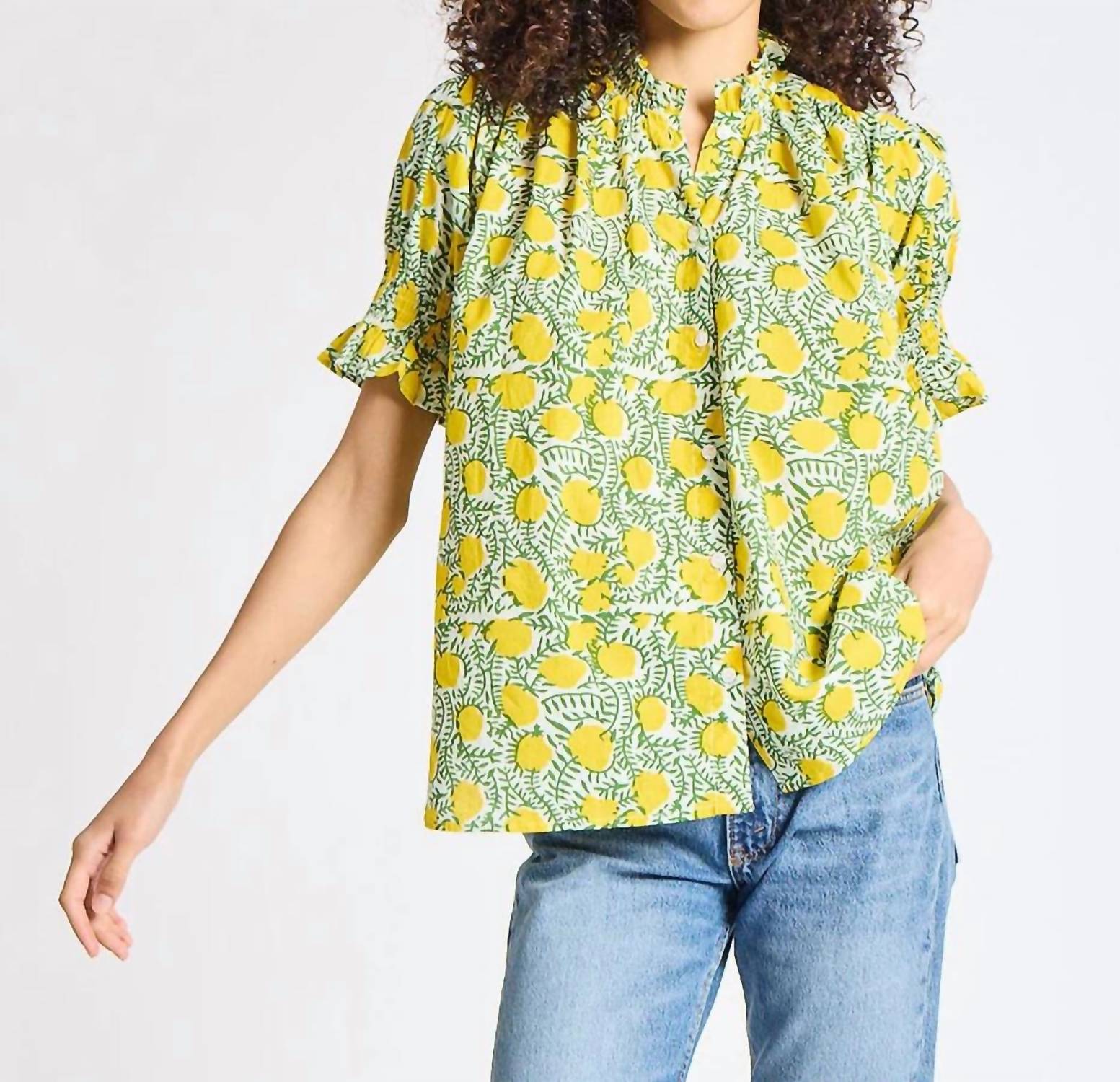 Pair this with your favorite jeans and slides for your next girls night out. Introducing the Marnie Ruffle Sleeve Blouse by MILLE, a chic addition to your summer wardrobe. Crafted from high-quality 100% cotton, this blouse features short sleeves and is adorned with a vibrant lemon print, bringing a touch of elegance with its smocked elastic cuffs and delicate ruffle mockneck. Closure: Button closure. The size range includes Small (Length: 28", Chest: 42"), Medium (Length: 28.5", Chest: 44"), and Large (Length: 29", Chest: 46"). Perfect for vacation getaways or Thanksgiving celebrations, this patterned blouse is the epitome of Y2K style.
