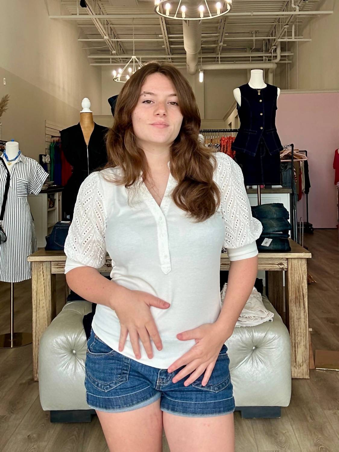 The perfect crop top for those warmer weather days. Elevate your wardrobe with the Puff Sleeve Contrast Top by Mystree, a chic addition in a sophisticated sand hue. This women's top features short puff sleeves and a scoopneck, blending seamlessly with its minimalist, solid pattern. Designed for versatility on vacation or during spring celebrations like the 4th of July. Featuring a button closure, it is easy to care for with machine wash instructions.