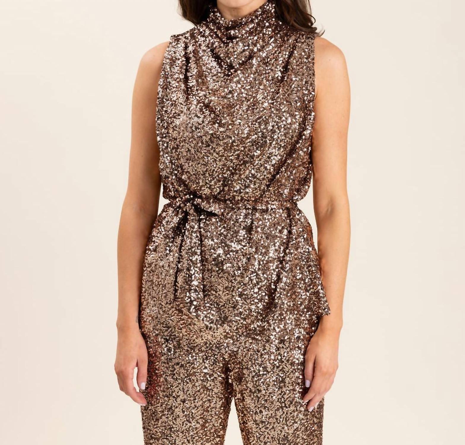 The perfect tank top for those warmer weather seasons. This sleeveless top features a mock neck and comes with a tie belt for added style versatility. Made from 100% Polyester, it ensures comfort and a sleek appearance. Care instructions are simple: hand wash with like colors and line dry, with low ironing if needed. The model is wearing a size Small.