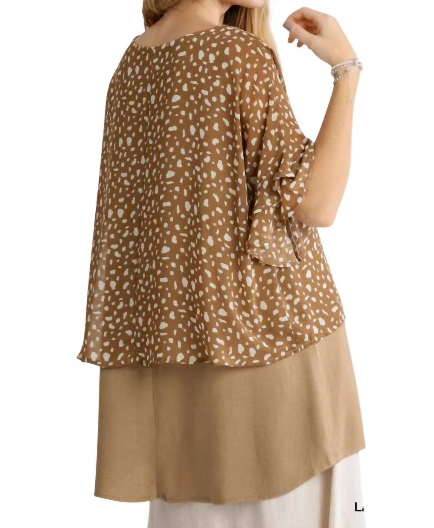 Embrace the effortless elegance of the Animal Print Chiffon Layered Overlay Top by Umgee. With its elbow-length sleeves, this sophisticated top is crafted from a luxurious blend of 55% Linen and 45% Rayon and showcases a chic animal print. The layered design with a high-low hemline features a flattering oversized A-line silhouette that delivers both comfort and style. This imported, pull-on blouse measures between 29" to 31" in length depending on size, making it a versatile addition to any wardrobe. Care for it with a gentle hand wash in cold water.
