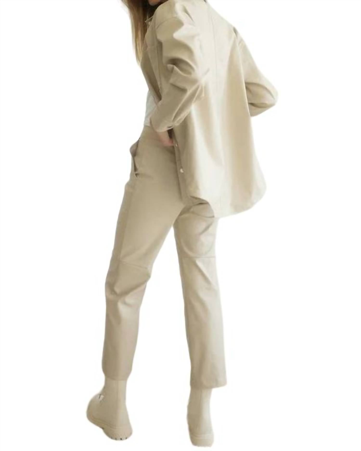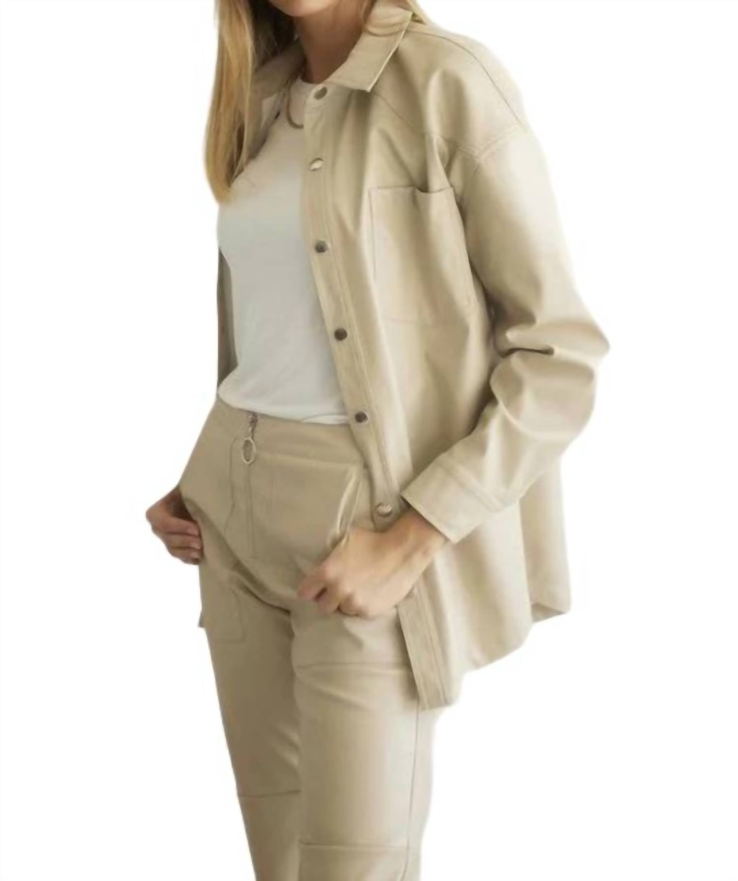 Featuring a button down design and faux leather material. Pointed collar neckline. Long sleeve. Chest pockets. Relaxed fit.