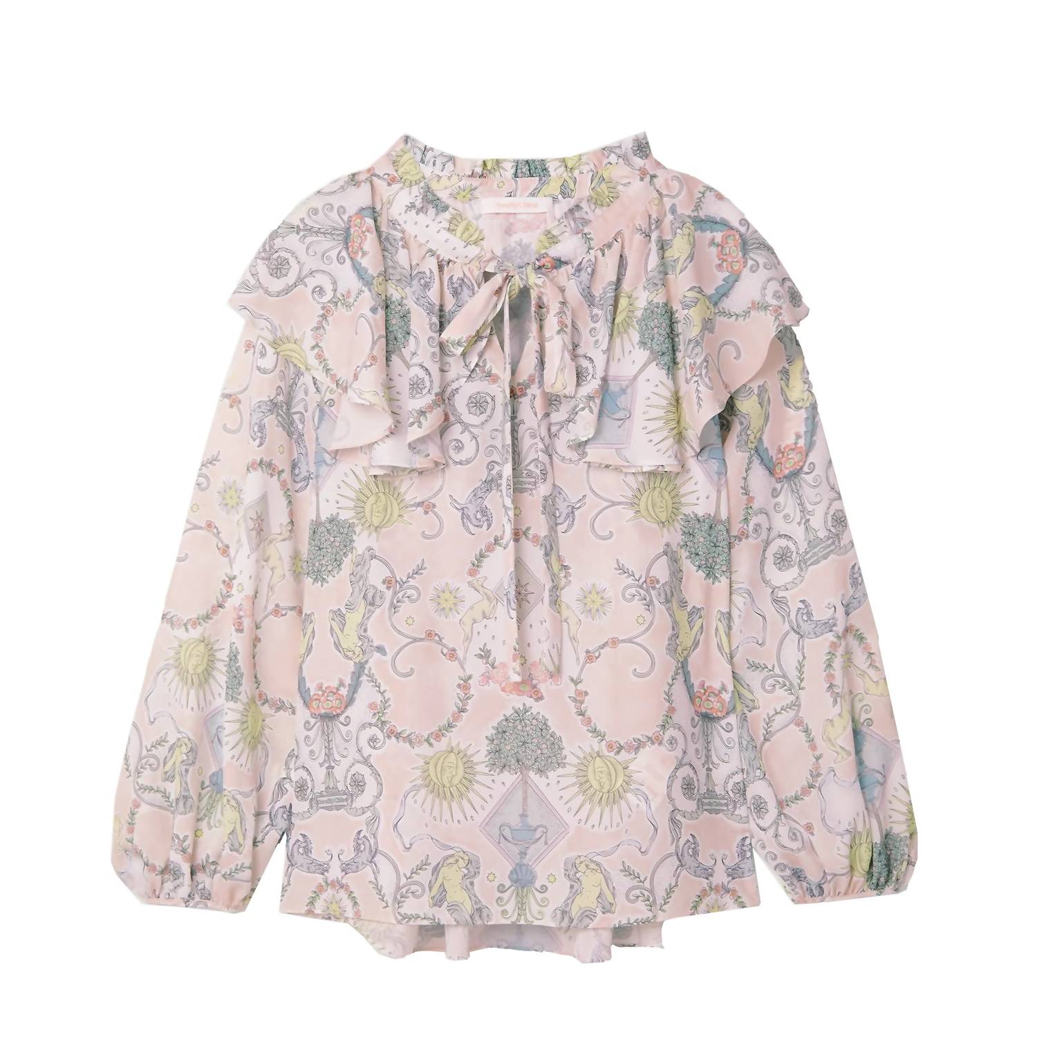 See By Chloé's blouse is made from crepe de chine printed with tarot card-inspired motifs in a pretty pastel colorway. Cut for a loose fit with a deep V-neckline, it has a flouncy ruffled collar and long ties that knot into a pussy-bow. Wear yours with tailored pants or jeans.